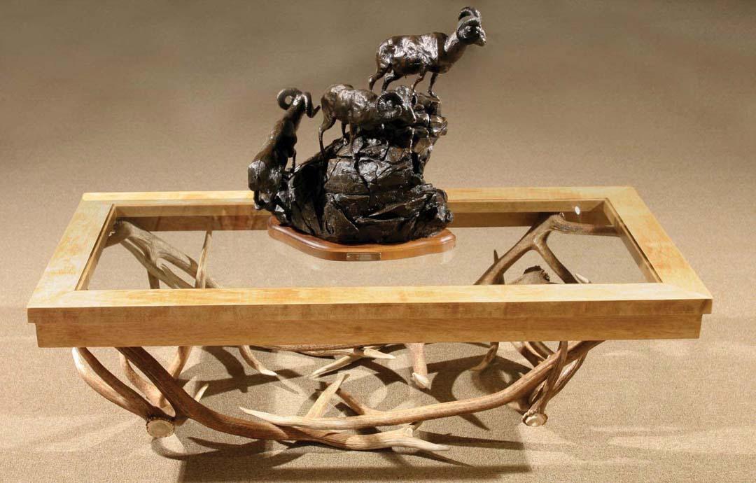 Elk Horn Coffee Table. Maple with glass top. 16" tall x 55" long x 28" deep. (est $1,000-$2,000). For condition reports please visit: www.auctioninsantafe.com/cr2011.pdf