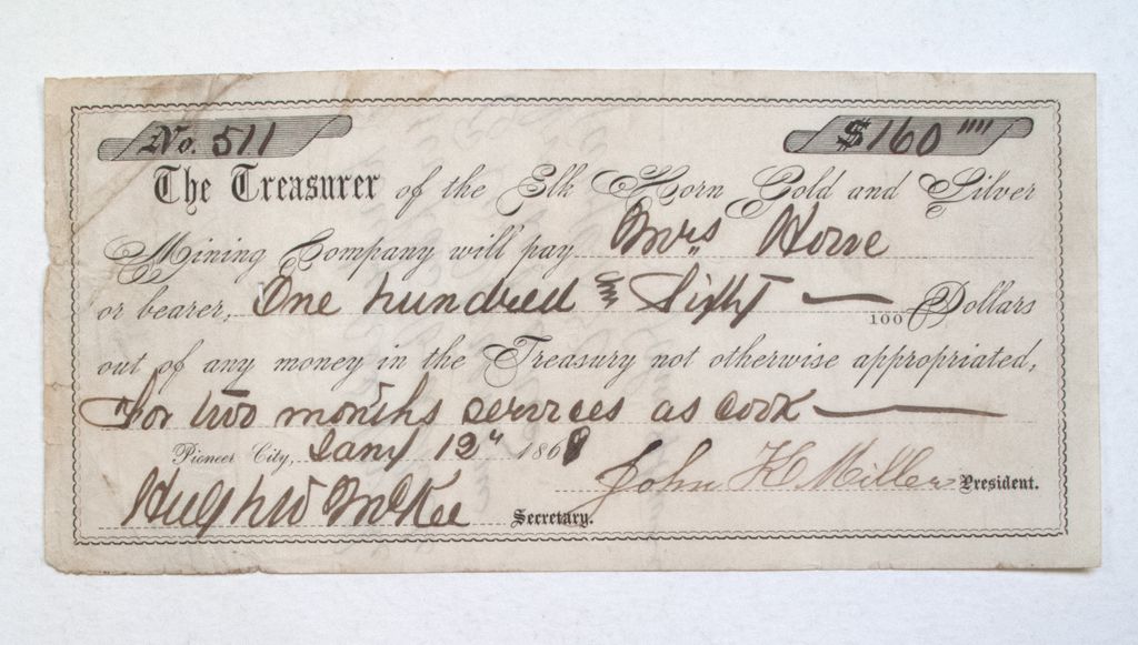 Receipt to pay Mrs. None(?) for two months service as a cook. Signed by president John Miller. Pioneer City was also known as Pioneerville and Hogem.? A mining town that was here and gone in handful of time. Pioneerville is located north of Boise off of Highway 21 near Grimes Pass, and still has a few standing buildings. The miners had to endure ore shortages and frequent raids by Indian warriors which led to it’s downfall. (Idaho Gold web site)City: Pioneer CityCounty: BoiseState: ID