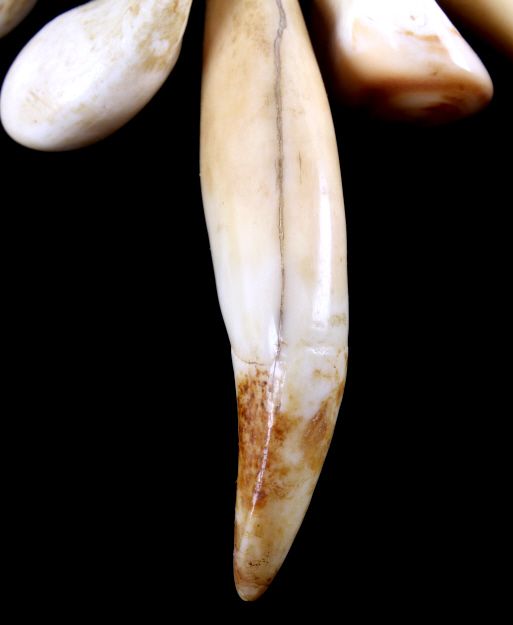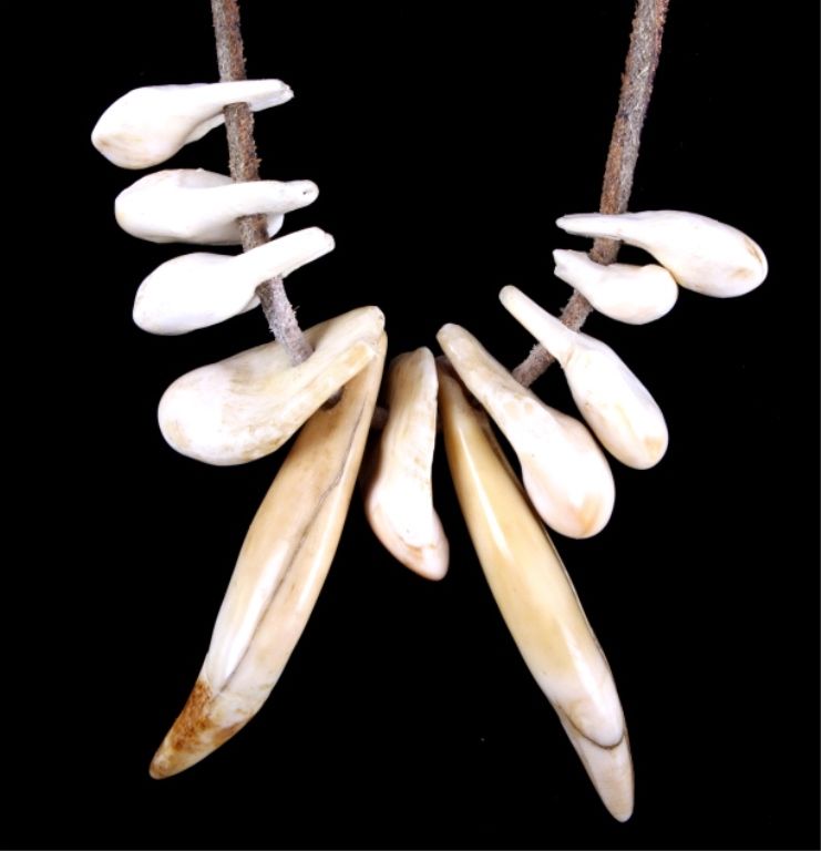 This lot features a collection of teeth from bear and elk. There are a total of 9 ivory elk teeth along with 2 bear teeth. The teeth are in very good condition. The elk ivories measure about 1" andf the bear teeth are 2.5"long.