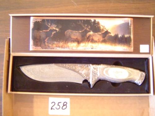 11" Knife, 6" acid etched blade, Elk Motif Handle in Wood Display Box