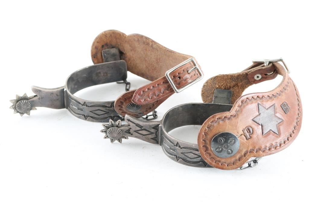 with stamped southwest design maker marked "ELK" with sterling with leather straps marked with star and "PB"