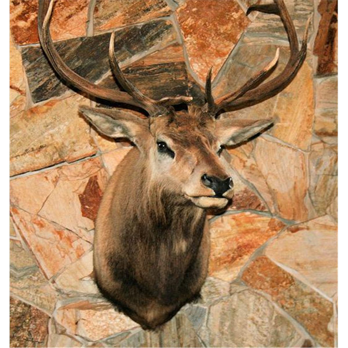 Elk mounted head base measures 28 inches high and 16 inches wide, Antlers are 34 inches wide and overall height is 55 inches