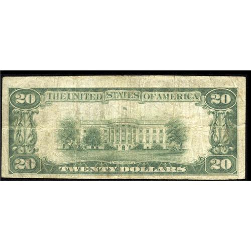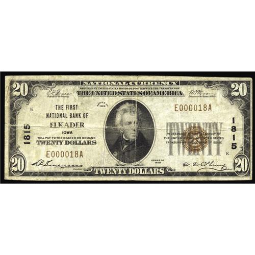 <B>Elkader, IA</B></I> - $20 1929 Ty. 1 <B>The First NB</B></I> Ch. # 1815<BR>The census from here includes only three of the $20 1929 Type 1 notes, including this <B>Fine</B></I> example. The note we offer tonight comes from the 18th of only 68 sheets issued of this denomination and type. Given the miniscule original issue, we doubt that an appreciable number of survivors remain in hiding.