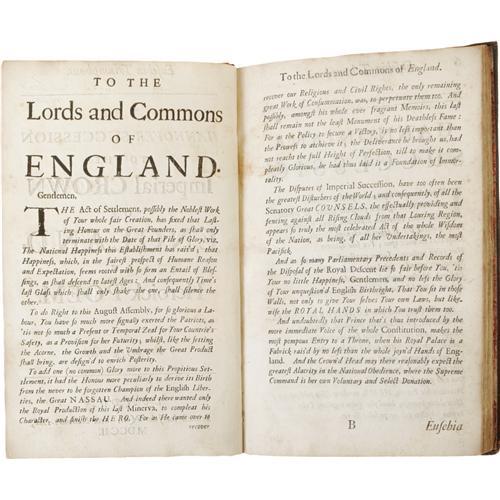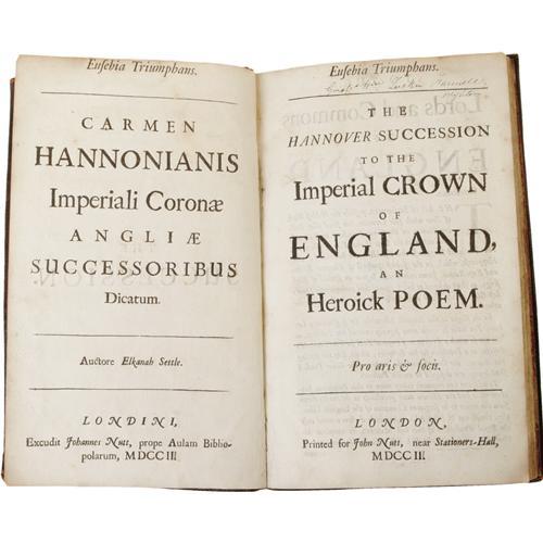<B>Elkanah Settle: <I>The Hannover Succession to the Imperial Crown of England, An Heroick Poem.</B></I></B></I> (London: Printed for John Nutt: 1702), 51 pages, first edition, tall slim 8vo (7" x 10.75"), parallel Latin and English text. Contemporary morocco binding by the author with blind detail to edges of boards some very minor discoloration and slight rubbing. Elkanah Settle, (1648-1724) was an English dramatist and poet. With the patronage of the Earl of Rochester, Settle's heroic dramas for a time rivaled those of Dryden.<BR><BR><b>Shipping:</b> Books & Catalogs (<a target="_blank" href="http://www.heritageauctions.com/common/shipping.php">view shipping information</a>)