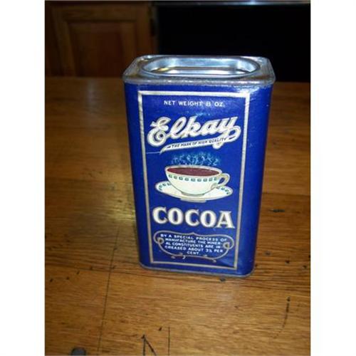 Another great little tin-Elkay Cocoa.In very gThis is a cardboard and tin box.ood condition.Measures 5 1/4" tall by 3" across.This is a cardboard and tin box.