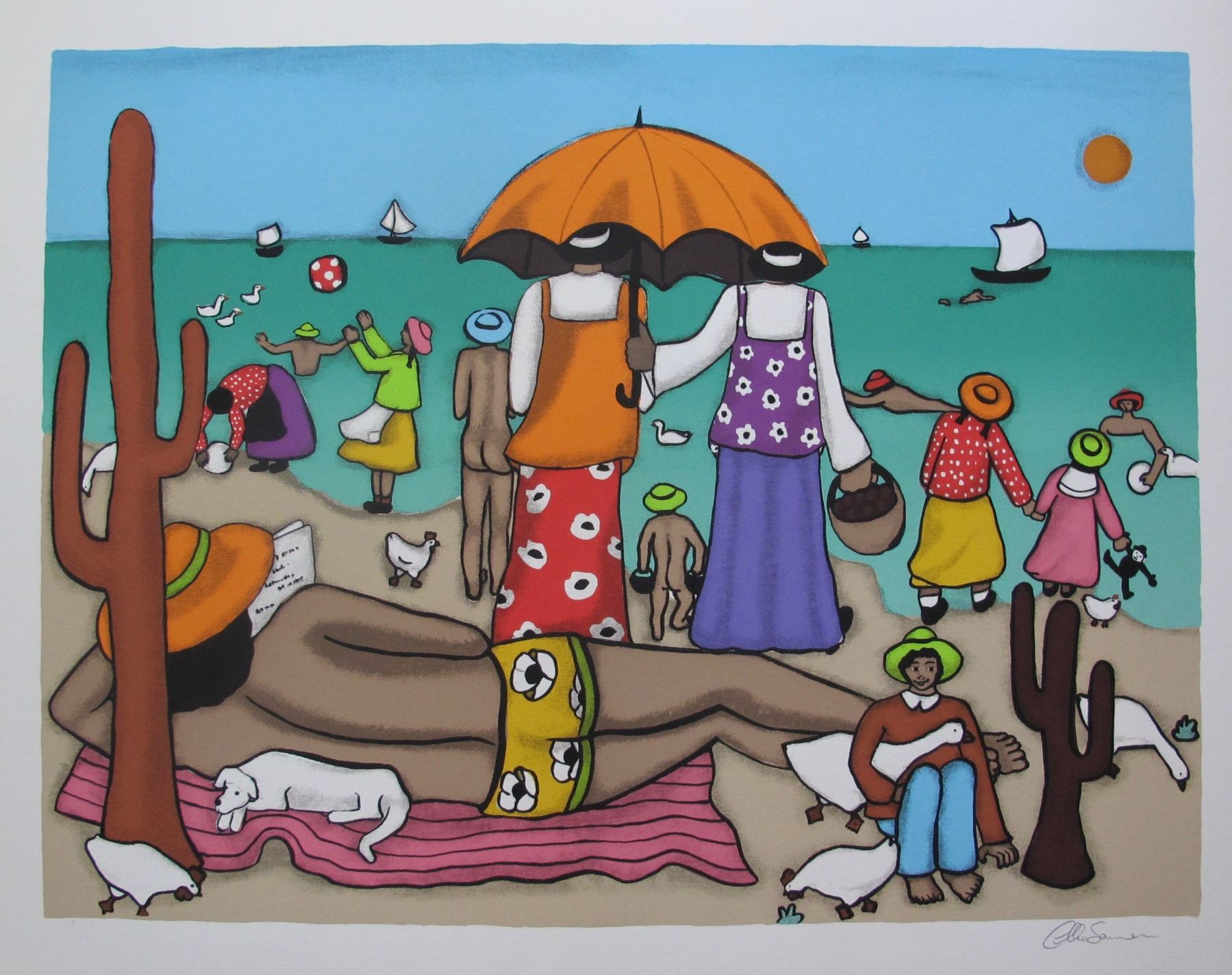 This is a limited edition hand signed serigraph titled On the Beach by renowned German actress and artist Elke Sommer. Beautiful art piece on extra thick paper with gorgeous colors. Hand signed and numbered by the artist. Paper measures: 32 inches x 26 inches. Image measures: 28 inches x 21 inches. This piece is numbered from an edition of 350. Comes with a gallery certificate of authenticity. Comes unframed. In excellent condition.