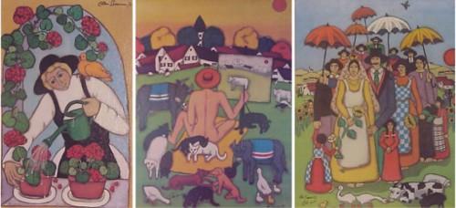 Elke Sommers (20th Century) European (three), PEASANTS, three color prints on canvas, each sign...