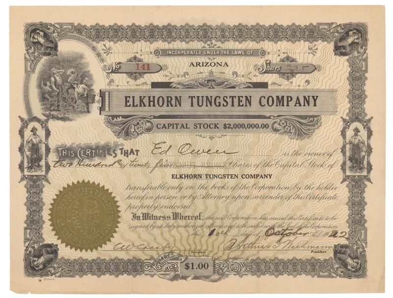 1922, Arizona. Stock certificate for 225 shares. Black/Gold. Six small vignettes of miners pictured within the border design. A larger vignette at top left of miners at work. Very slight paper loss at lower left corner. Uncancelled and fine.