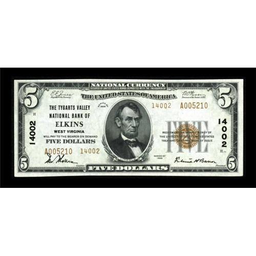<B>Elkins, WV</B></I> - $5 1929 Ty. 2 <B>The Tygarts Valley NB </B></I> Ch. # 14002<BR> A bright and fresh example with loads of originality, ex Hickman-Oakes' November 181 auction, lot 420. <B>Very Choice Crisp Uncirculated,</B></I> a lovely 14000 charter example. <BR><I>From The Thomas A. Bergin Collection</B></I><BR><BR><b>Shipping:</b> Coins & Currency (<a target="_blank" href="http://www.heritageauctions.com/common/shipping.php">view shipping information</a>)