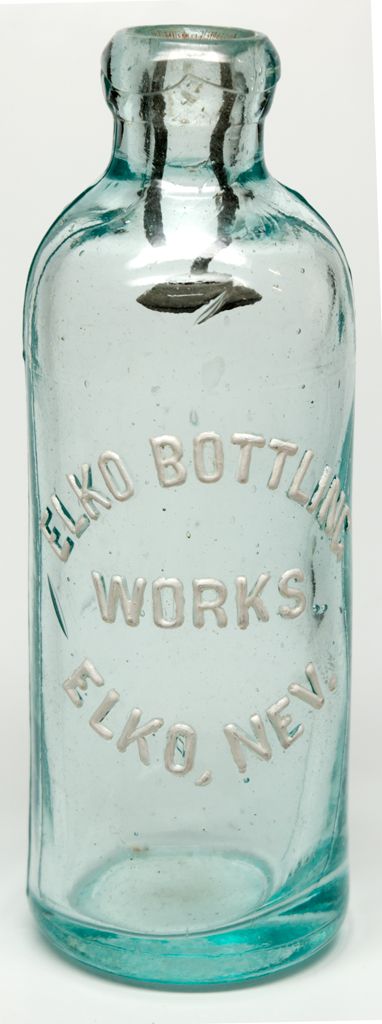 Hutchinson style bottle with gravity stopper, Elko Nevada Variety, with tooled top and artistic seam. The bottle has embossed lettering, white in color. The bottle's heavy glass is very light aqua in color. There is no maker's mark on the base. These bottles were designed and patented by William Roorbach in 1885. James Talbot decided to start a small soda business in Elko in 1869. He continued until his retirement in 1891. He sold his business to one James Dewar, a Scotsman, and he began his soda business in 1892. His business was known as Elko Soda Works, and continued until 1899. Mint condition. -60214