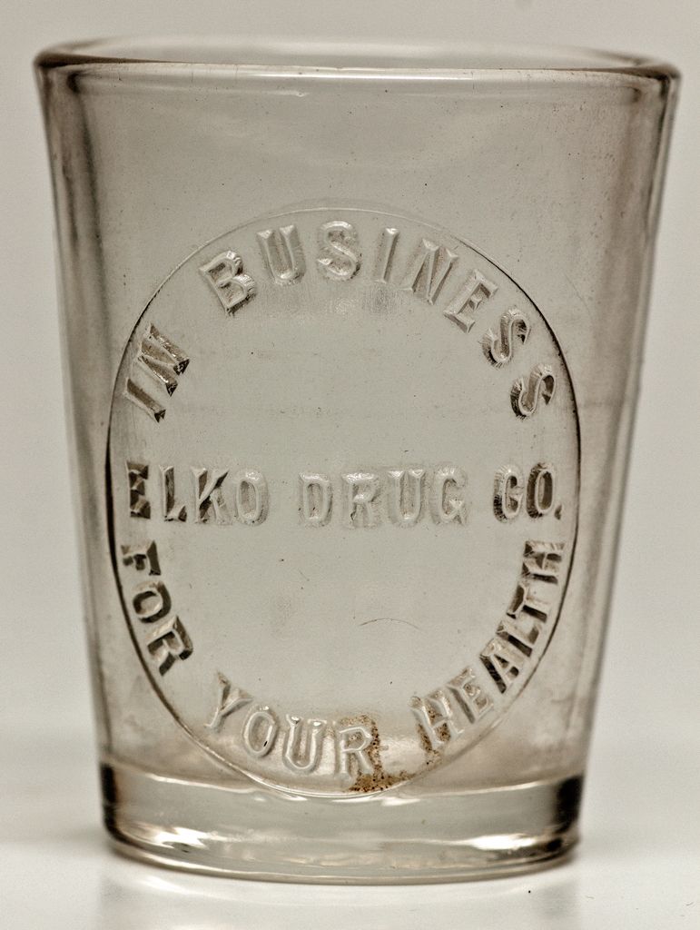 A 2” dose glass. Slug embossed “In Business/ Elko Drug Co./ For Your Health”. The rear of the glass is embossed “Table/ Dessert/ Tea” to the right of three etched lines. The bottom is embossed “W.T. Co./ AL/ U.S.A.” Clear glass, pristine. The Elko Drug Company succeeded the Elko Drug Store and, as a company, was the longest continuously running drug store in Nevada’s history. F.J. Schneider opened the first drug store in Virginia City, and was also the first druggist in Elko [Ref: Nevada History Through Glass, Vol 2, Fred Holabird, p. 67]. He only ran the Elko Drug Store for two years, and then Frank Muller took over in 1876 before he sold to Frank F. Miller [Ref: Nevada History Through Glass, Vol 2, Fred Holabird, p. 67]. This dose glass is one of only two known specimens. - Jacobitz Collection -59780