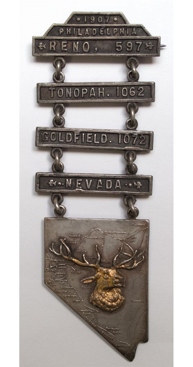 Elks badge with Reno, Tonopah, and Goldfield all-in-one. This is part of the Ames Collection.