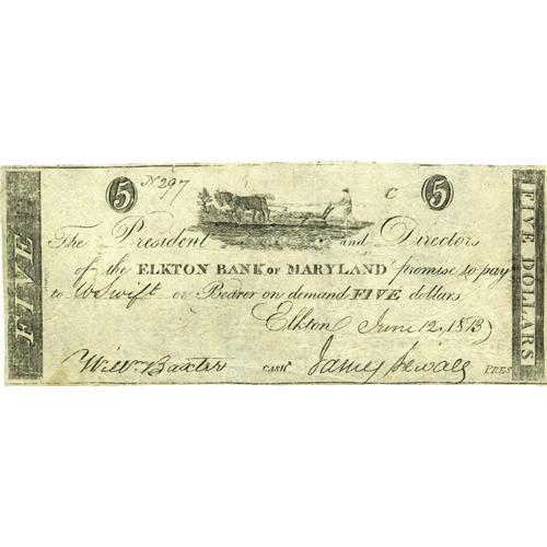 <B>Elkton, MD- Elkton Bank</B></I> $5 June 12, 1813 C32<BR>Bright with a small top edge tear. The only genuine notes of this design are proofs. <B>Very Fine.</B></I>