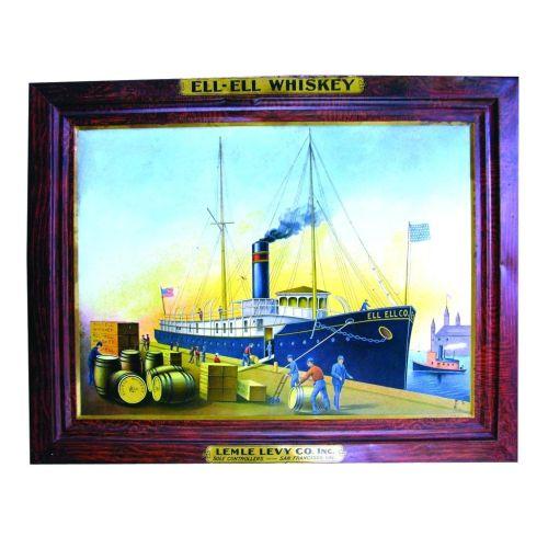 Extremely Rare Ell-Ell Whiskey Lemle Levy Inc. San Francisco, CA. Self framed tin sign. Fabulous Ship Dock image. The H.D. Beach Co. Coshocton, OH. Lithographers. Some minor restoration, some rust around the edge otherwise good condition. 28 1/2 X 22 1/2 inches.