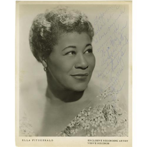 <B>Ella Fitzgerald Signed Photo.</B></I> A b&w 8" x 10" promo photo, inscribed to actress Kaye Ballard and signed by Fitzgerald in blue ink. In Excellent condition with light tanning around the edges. <I>Accompanied by LOA from PSA/DNA.</B></I> <BR><BR><B>Important notice: