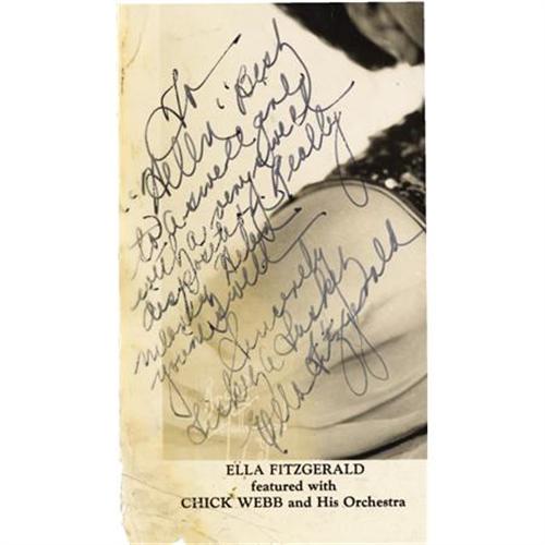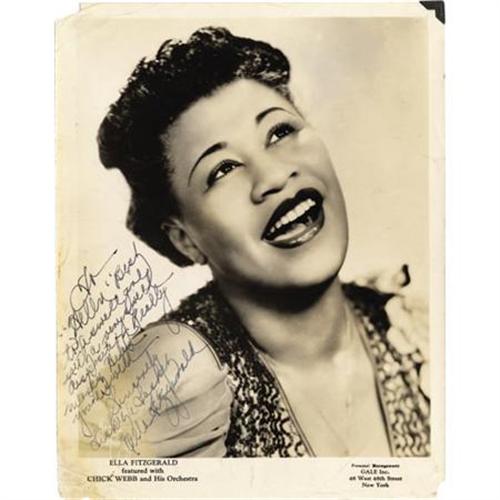 <B>Ella Fitzgerald Signed Photo.</B></I> A vintage b&w 8" x 10" photo of the legendary Jazz singer, inscribed and signed by her in black ink. In Fine condition with moderate toning and wear to the edges and corners.<BR><BR><b>Shipping:</b> Flat Material, Small (<a target="_blank" href="http://www.heritageauctions.com/common/shipping.php">view shipping information</a>)
