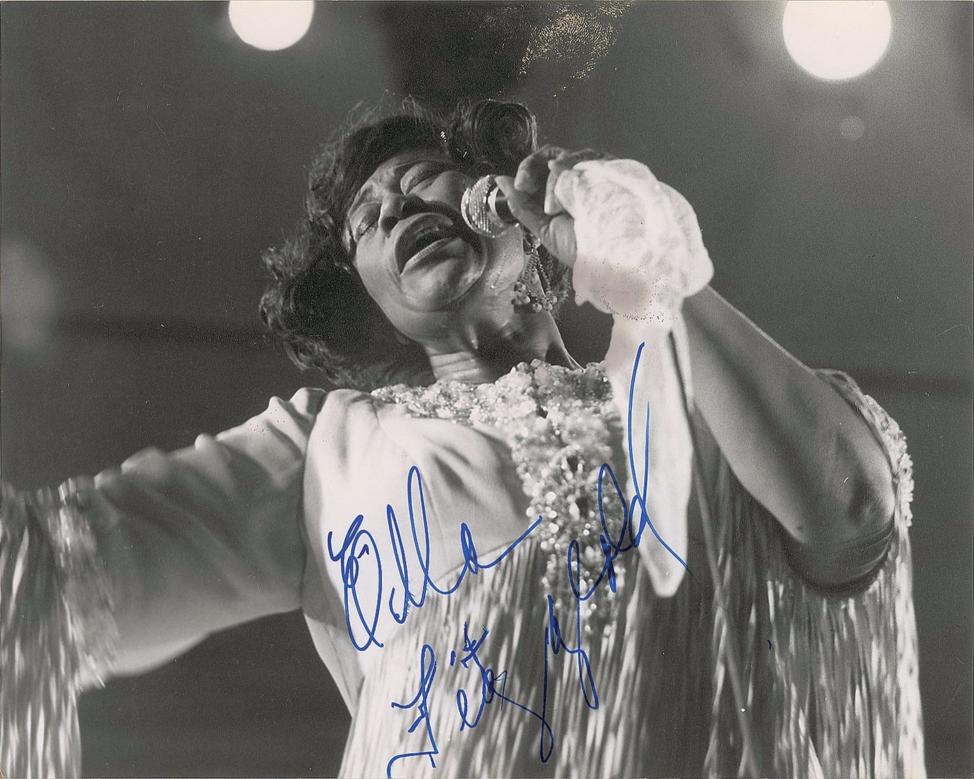 Satin-finish 10 x 8 photo of Fitzgerald during a soulful performance, signed in blue felt tip. Reverse bears a 1983 David Redfern copyright stamp. In fine condition, with some light scuffs and light stains. From the Harvey and Rhoda Kuflik Collection.