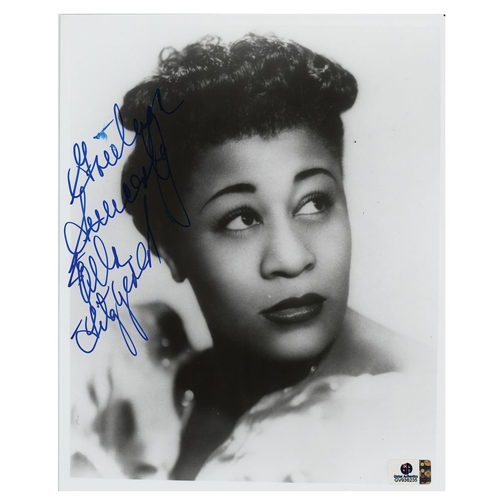 Attractive glossy 8 x 9.75 close-up photo of 'The First Lady of Song,' signed in blue felt tip, "Greetings, sincerely, Ella Fitzgerald." In fine condition.