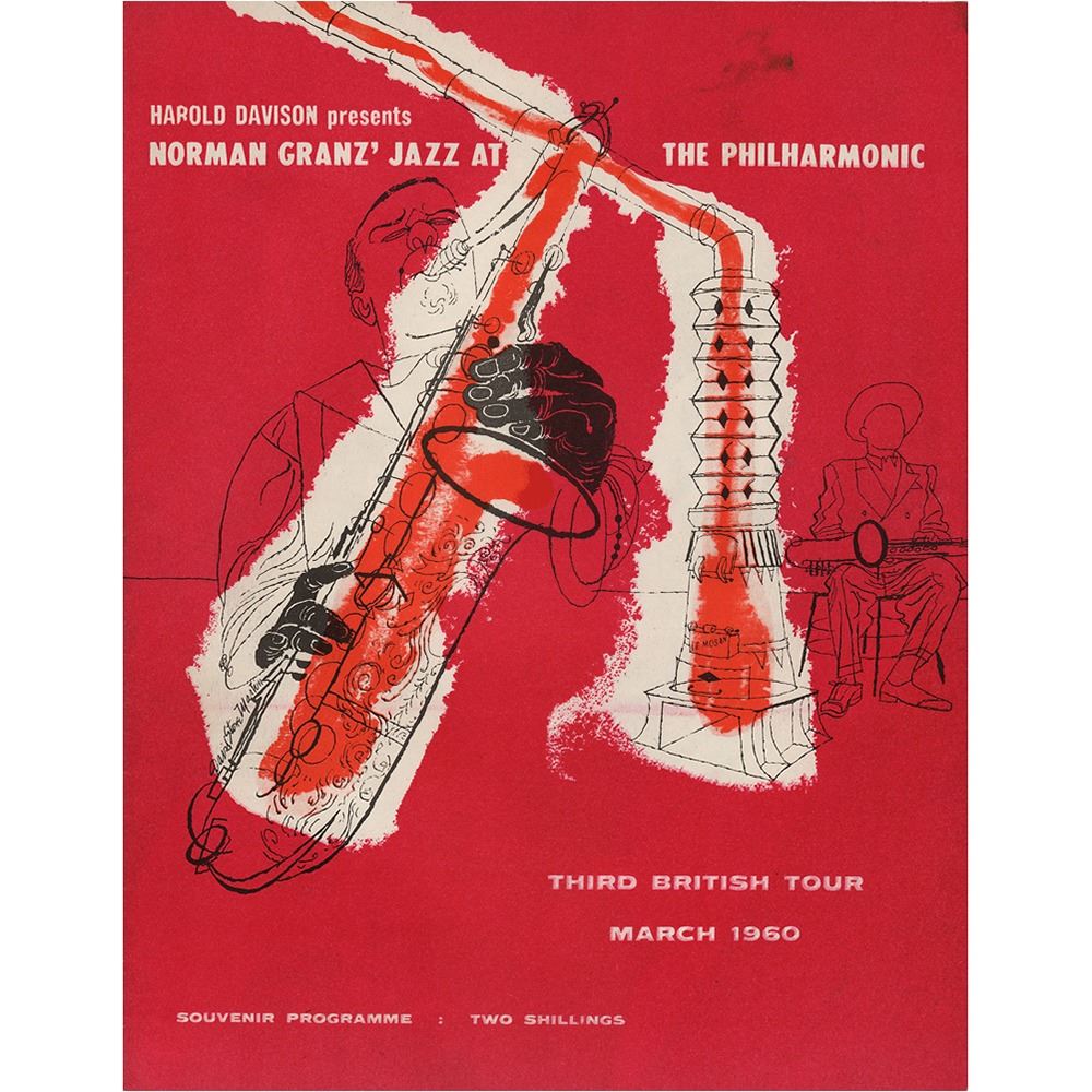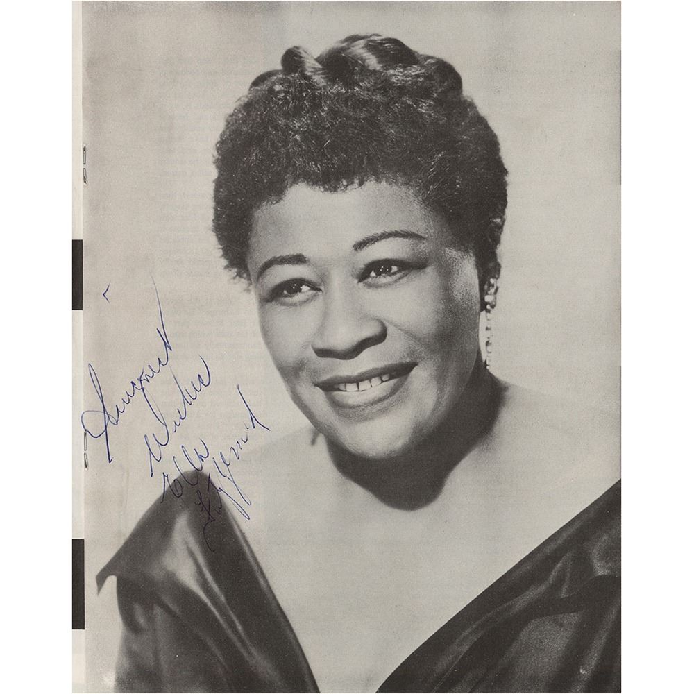 Vintage program for the third British Tour of Norman Granz’ Jazz at the Philharmonic, held in March 1960, 16 pages, 8 x 10.5, signed inside next to her likeness in blue ballpoint, “Sincerest wishes, Ella Fitzgerald.” The consignor notes that the signature was obtained backstage at the De Montfort Hall in Leicester, England, in the 1960s by Leicester Reporter journalist Bess Coleman, who later worked for the Brian Epstein company NEMS, toured the USA with the Beatles in 1966, and become editor of the American magazine Teen Life. In fine condition. Accompanied by a certificate of authenticity from Tracks.