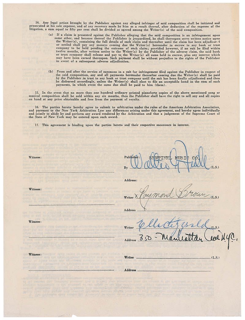 DS, signed “Ella Fitzgerald” and “Raymond Brown,” two pages both sides, 8.5 x 11, March 28, 1947. Agreement between Sentinel Music Co. and Fitzgerald and Brown regarding royalties for distribution of sheet music to a piece entitled ‘No Sense.’ Light creases to the corners and scattered toning, and a staple hole with slight paper loss to the bottom edge, otherwise fine condition.
