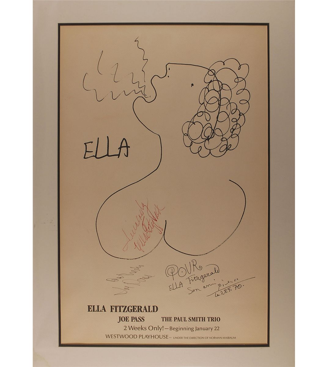 Concert poster featuring a 1970 sketch of Fitzgerald by Picasso, 21 x 32.5, advertising a concert featuring Ella Fitzgerald and Joe Pass at the Westwood Playhouse, signed in red felt tip, “Sincerely, Ella Fitzgerald,” and black felt tip, “Best wishes, Joe Pass.” Double-matted to an overall size of 27 x 38.5. In fine condition.