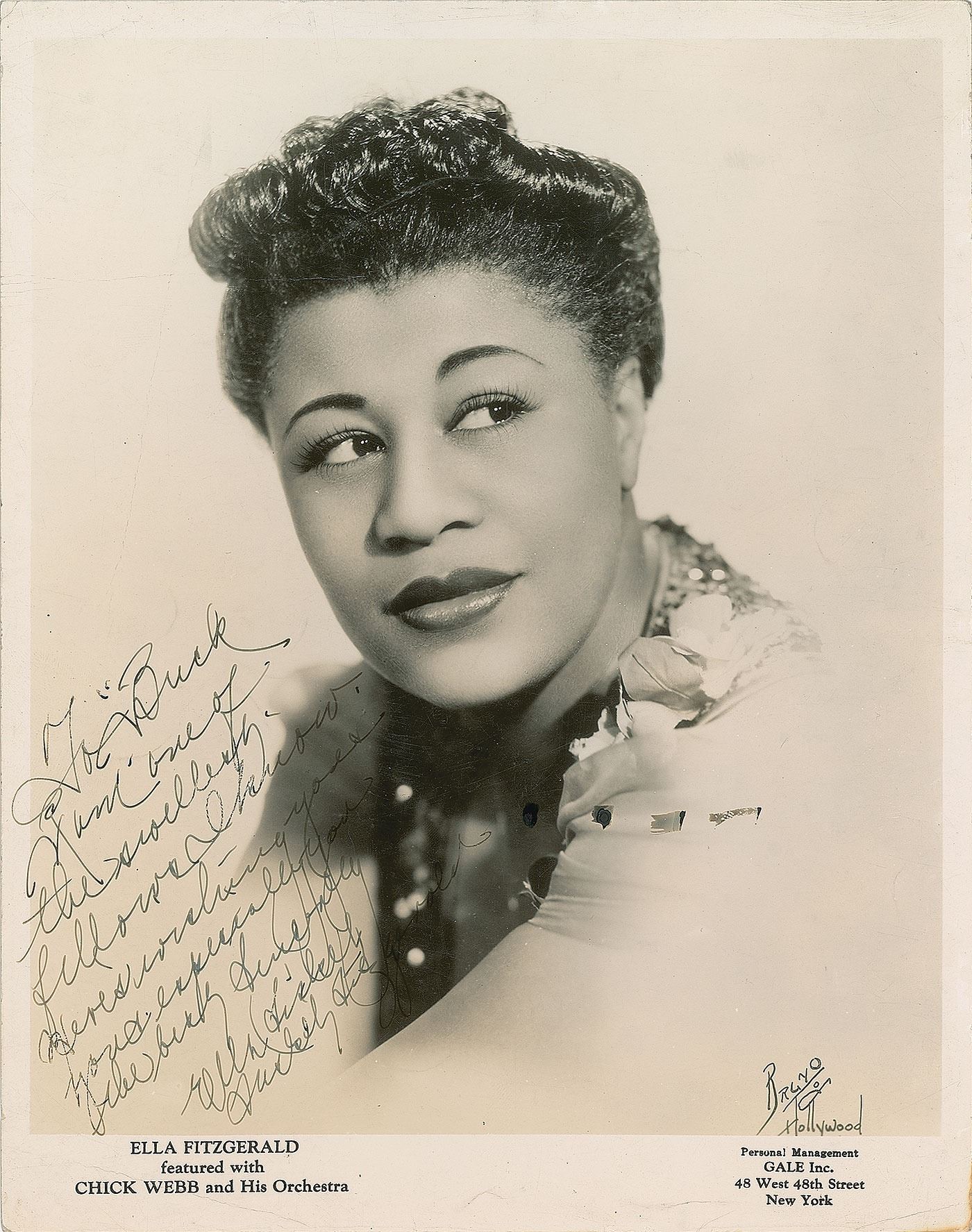 Vintage glossy 8 x 10 publicity photo of Fitzgerald in a tender close-up pose, signed and inscribed in fountain pen, "To 'Buck,' you're one of the swellest fellows I know. Here's wishing you & you & especially you the best, Sincerely, Ella (Tisketty Tasketty) Fitzgerald," playing off of her 1938 hit 'A-Tisket, A-Tasket' in her signature. In very good to fine condition, with scattered light creasing, and two slightly heavier creases to the left of her head.