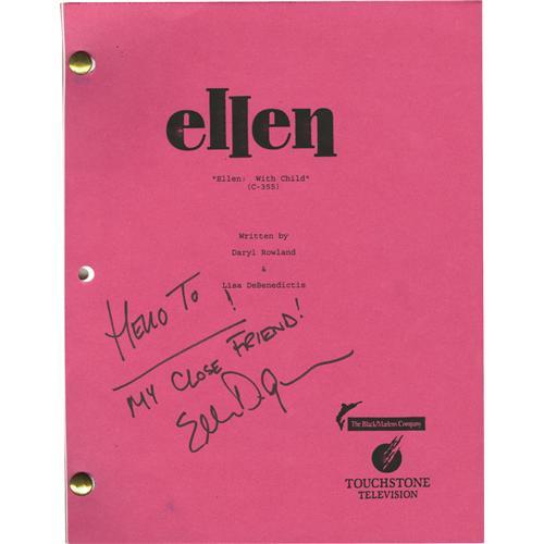 <B>Ellen DeGeneres Signed Script.</B></I> A copy of of the screenplay for a season 3 episode of <I>Ellen</B></I> titled "Ellen with Child," inscribed "Hello to _____! My close friend!" and signed by DeGeneres in black felt tip. In Excellent condition.<BR><BR><b>Shipping:</b> Flat Material, Small (<a target="_blank" href="http://www.heritageauctions.com/common/shipping.php">view shipping information</a>) <BR><BR><B>Important notice:</