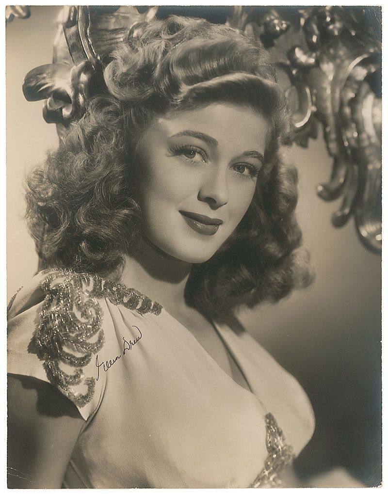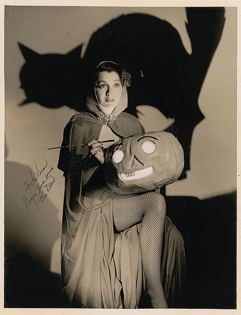 Two gorgeous photos: matte-finish 10.25 x 13.25 bust portrait of Drew, signed in black felt tip; and a glossy 10 x 13 photo of Drew posing in a Halloween scene, signed and inscribed in black felt tip, “To LaVerne, Every good wish, Ellen Drew.” In overall fine condition, with a few creases to the Halloween photo.