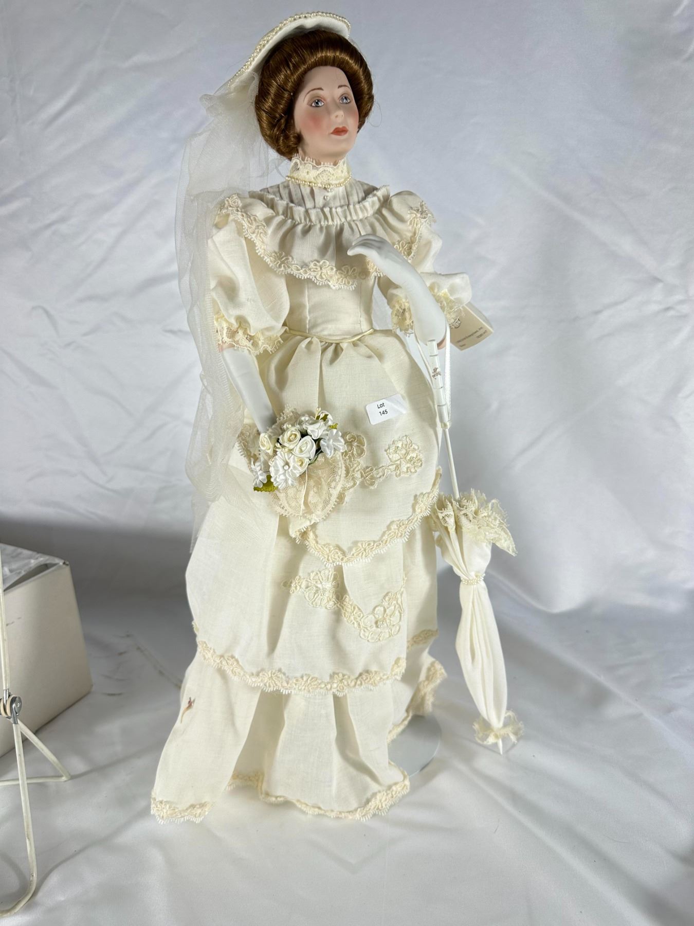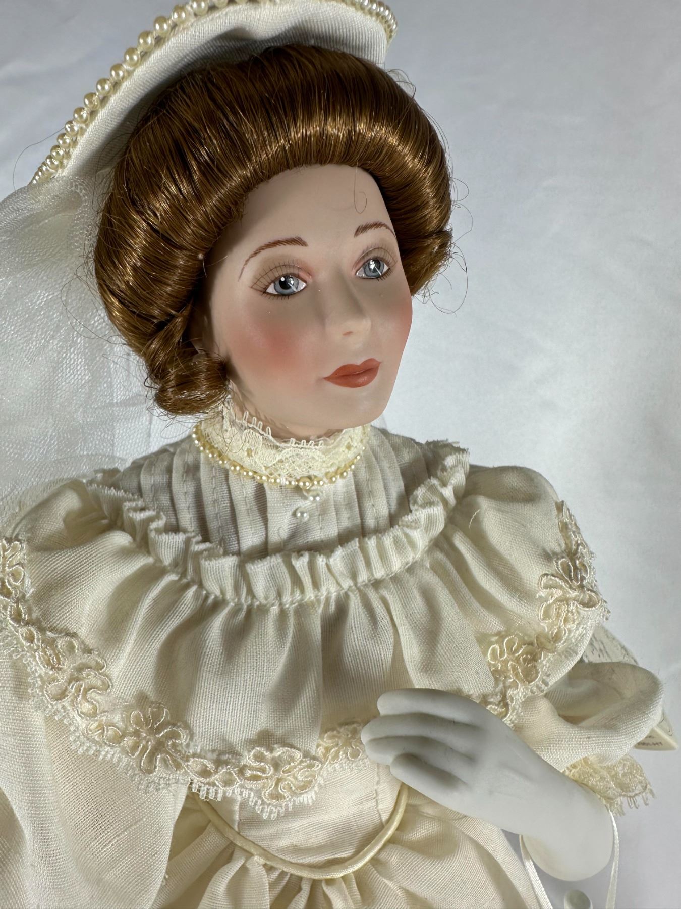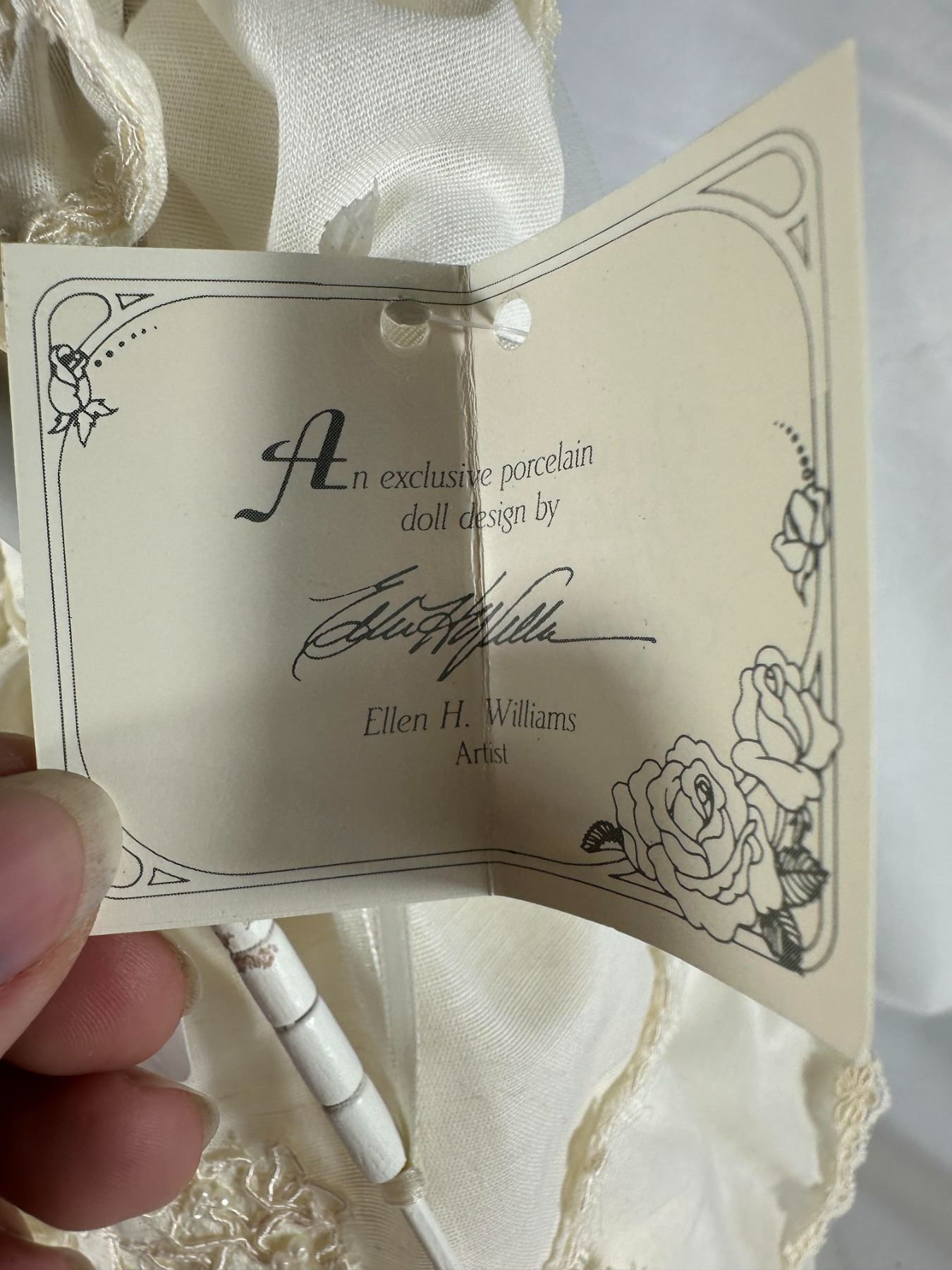 Designed by Ellen H. Williams, this elegant porcelain bride doll wears an ivory lace-trimmed wedding gown with veil, bouquet, and parasol. Features hand-painted facial details, brunette updo, and includes original signed artist’s hang tag.