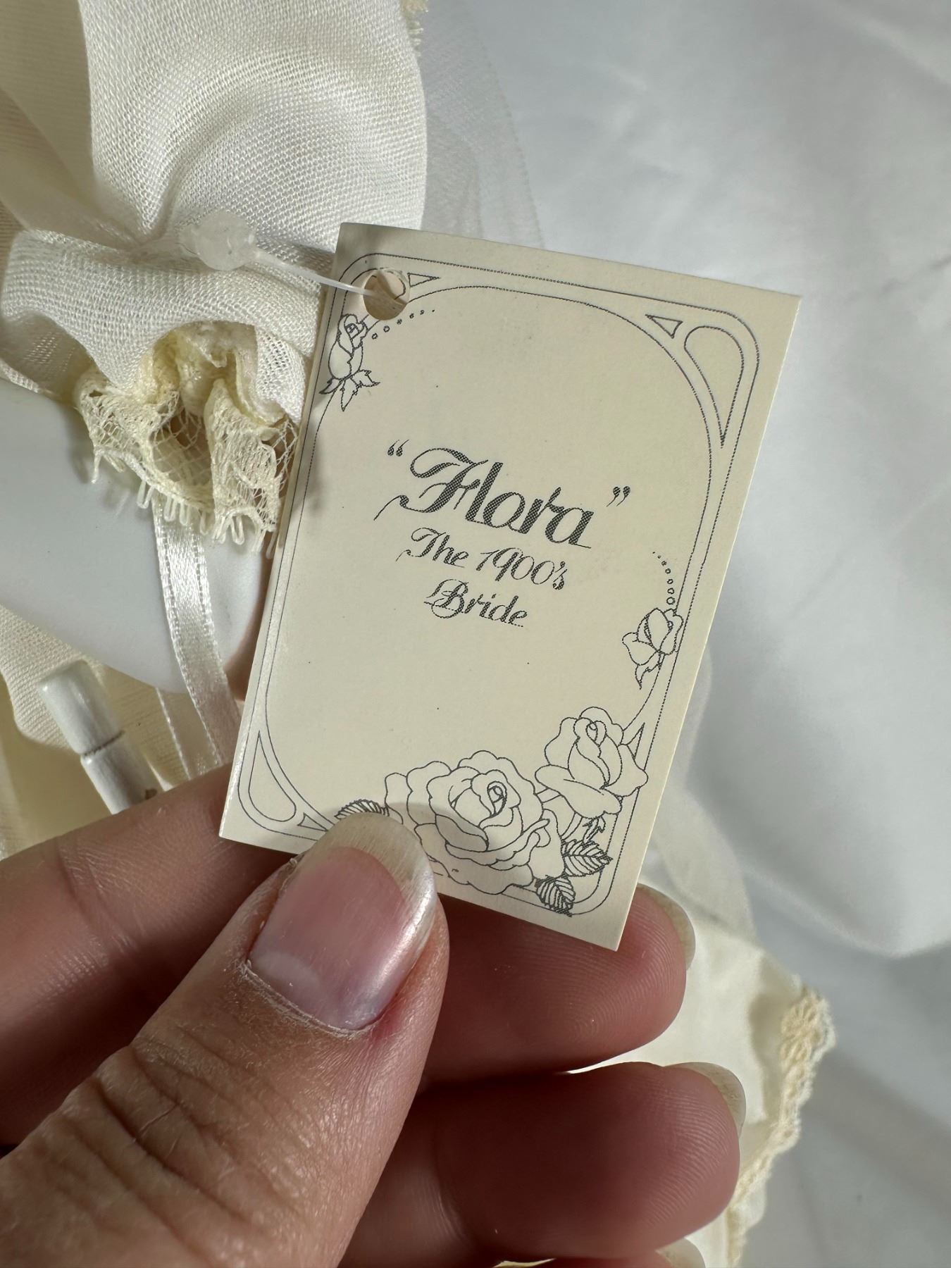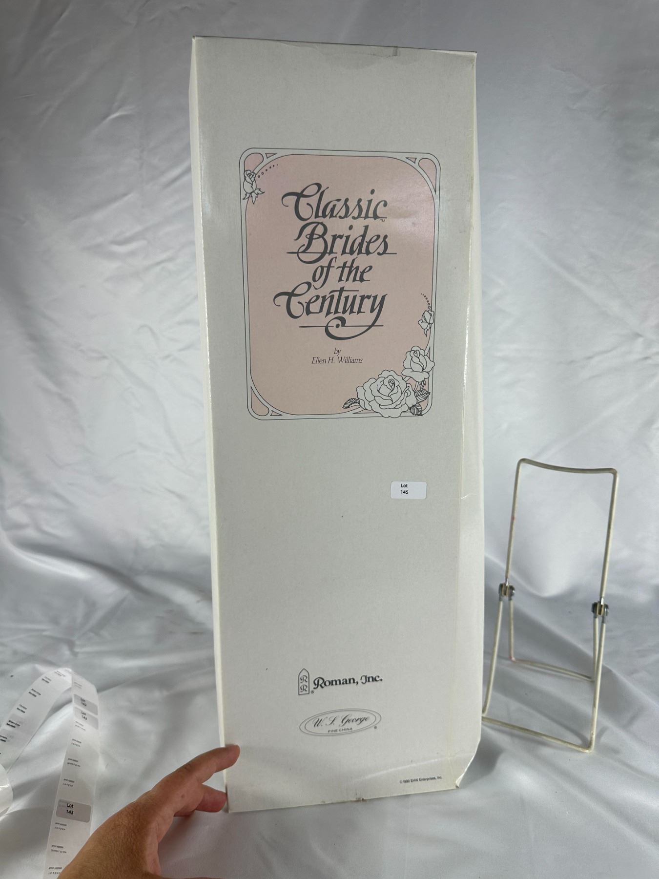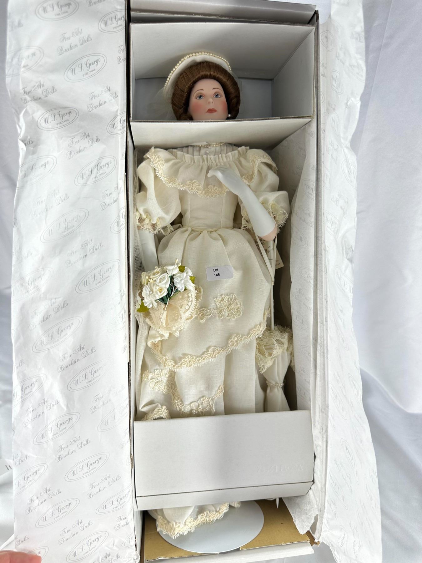Designed by Ellen H. Williams, this elegant porcelain bride doll wears an ivory lace-trimmed wedding gown with veil, bouquet, and parasol. Features hand-painted facial details, brunette updo, and includes original signed artist’s hang tag.