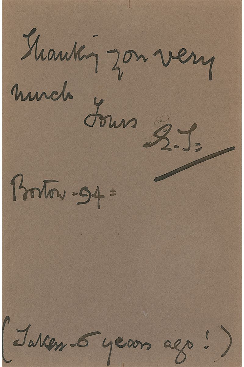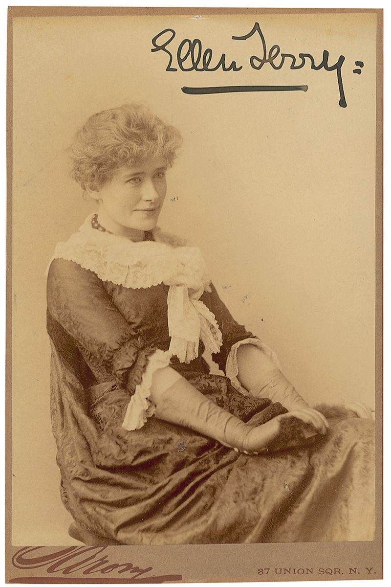 Vintage 4 x 6.25 cabinet photo by Sarony of New York, signed in the upper right in ink. An ANS from Terry on the reverse reads, “Thanking you very much. Yours, E. T., Boston ‘94, (Taken 6 years ago!)” Mild scattered toning and soiling, slight silvering to dark areas of the image, and trimmed edges, otherwise fine condition.