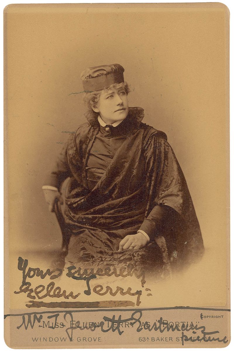 Popular British stage actress (1847–1928) best known for her Shakespearean roles. Original 4.25 x 6.5 cabinet photo of Terry as Portia by Window and Grove of London, signed and inscribed in black ink, “Yours sincerely, Ellen Terry,” adding “Mr. T. Jewitt Eastman’s picture.” Scattered toning to darker portions of image, some stray ink marks, and mounting remnants on reverse, otherwise fine condition.