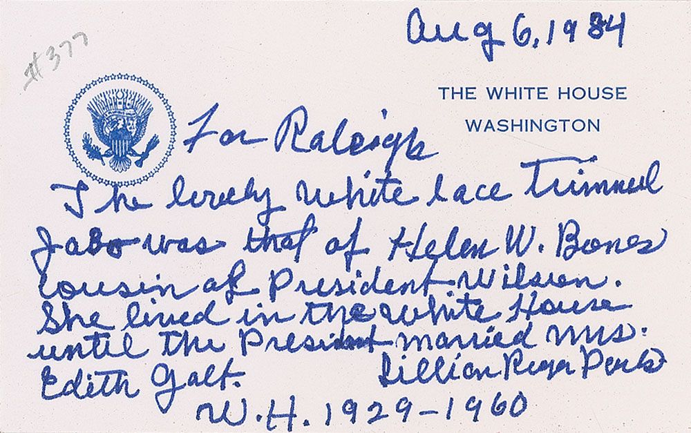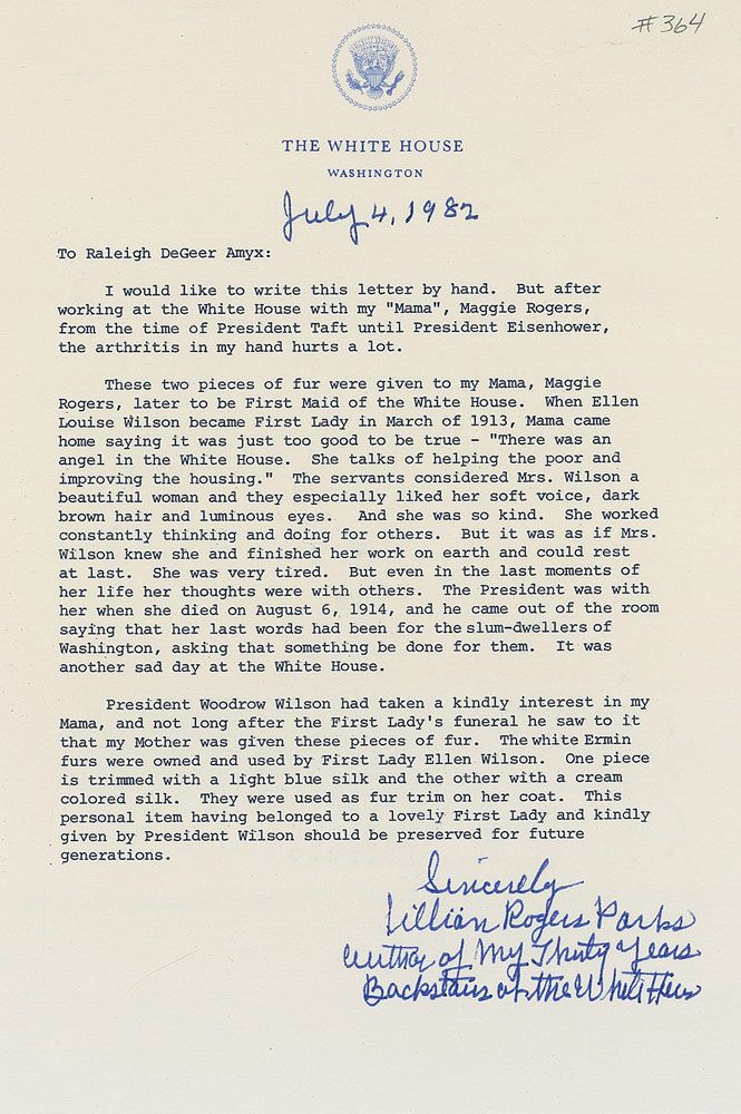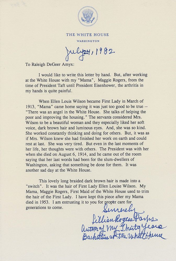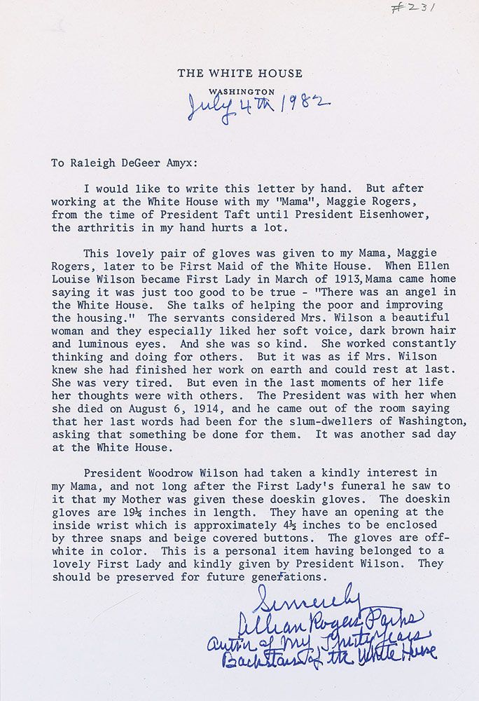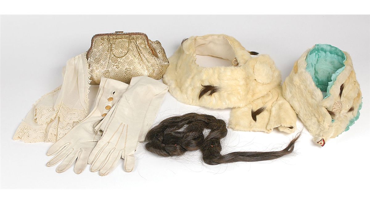 Interesting collection of five items, all personally-owned by the Wilson family during their time in the White House: a pair of fine white ermine fur pieces used by First Lady Ellen Wilson as trim for her coat; a fine pair of off-white doeskin gloves, personally-owned by First Lady Ellen Wilson; a long braid of First Lady Ellen Wilson’s hair kept by Maggie Rogers, who regularly trimmed her hair; a beautiful evening purse embroidered with gold thread, personally-owned by President Woodrow Wilson’s cousin, Helen Bones; and a white lace cravat personally-owned by Helen Bones. Includes detailed letters of provenance on White House letterhead from Lillian Rogers Parks, who was a best selling author as well as housekeeper and seamstress at the White House for over 30 years, from President Hoover through President Eisenhower. Helen Bones was Woodrow Wilson’s first cousin and she actually resided with the Wilson family at the White House for six years, serving the administration in various capacities, including as First Lady Ellen Axson Wilson’s social secretary. Fascinatingly, it was Ms. Bones who first introduced President Wilson to Edith Galt, whom he married shortly thereafter. Personal items belonging to the first Mrs. Wilson are virtually nonexistent.