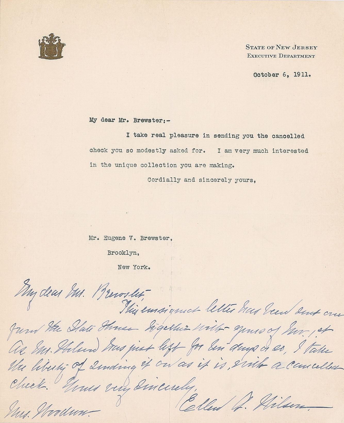 ALS signed “Ellen A. Wilson,” penned at the bottom of a typed letter from the office of Governor Woodrow Wilson to collector Eugene V. Brewster, one page, 8 x 9.75, State of New Jersey, Executive Department letterhead, October 6, 1911. Ellen's handwritten response: "This unsigned letter has been sent over from the State House together with yours of Nov. 1st. As Mr. Wilson has just left for ten days or so, I take the liberty of sending it on as it is, with a cancelled check. Yours very sincerely." She adds "Mrs. Wilson" in the lower left corner. In fine condition.