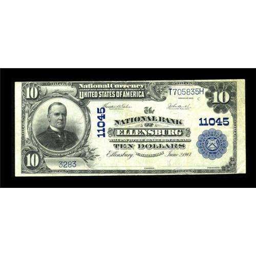 <B>Ellensburg, WA</B></I> - $10 1902 Plain Back Fr. 632 <B>The NB of Ellensburg</B></I> Ch. # 11045<BR> This bank was by far the scarcer of Ellensburg's two Blue Seal issuers, with large offerings from here few and far between in recent years. Just seven large examples are listed in the census, with this a new entrant to that listing. <B>Very Fine,</B></I> with the signatures a bit faded and a couple of minor margin splits that must be mentioned as well. <BR><I>From The Walla Walla Collection</B></I><BR><BR><b>Shipping:</b> Coins & Currency (<a target="_blank" href="http://www.heritageauctions.com/common/shipping.php">view shipping information</a>)