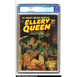 Ellery Queen #2 (Ziff-Davis, 1952). Wow! What an awesome cover! Bondage, cleavage and a red hot poker. It just doesn't get any better than that. This cover was painted by pulp legend Norman Saunders, perhaps best known for his work on the Mars Attacks trading cards of the early 1960s. A very tough book to find in any grade. CGC VF 8.0 Off-white pages. Overstreet 2001 FN 6.0 value = $116; NM 9.4 value = $310. Important notice: We expect to be auctioning lots at the rate of 200-250 per hour. Sometimes eBay Premier live bid software cannot keep up with that pace, so we strongly recommend that you place a realistic proxy bid now as insurance to avoid disappointment. Also please note that all Heritage/CAA lots purchased through eBay Premier carry a 20% Buyer's Premium.