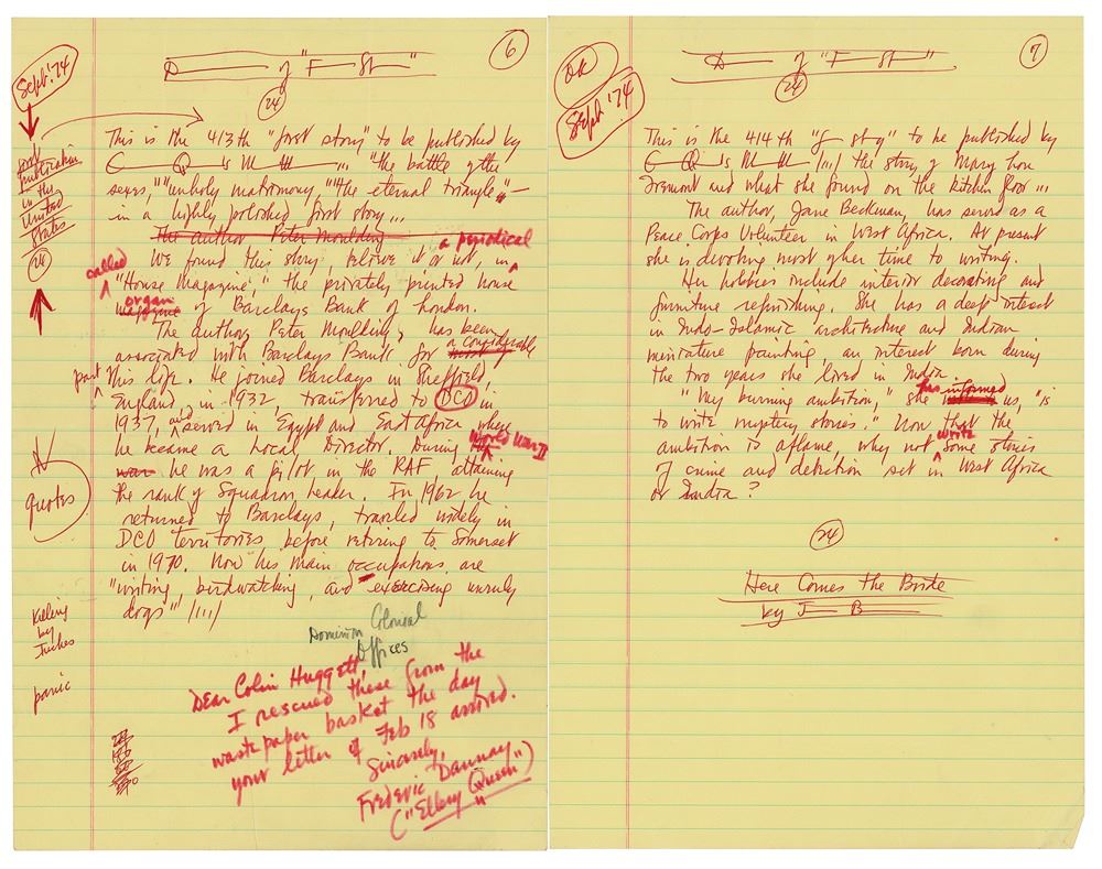 AMS, two pages, 8 x 12.5, circa September 1974, signed and inscribed at the foot in red felt tip, "Dear Colin Huggett, I rescued these from the waste paper basket the day your letter of Feb. 18 arrived. Sincerely, Frederic Danny, ('Ellery Queen')." The pages, numbered "6" and "7," both offer brief handwritten introductions to stories published in the Ellery Queen Mystery Magazine with some information on the authors. The first, in part: "This is the 413th 'first story' to be published by E-- Q--'s M-- M--…We found this story, believe it or not, in a periodical called 'House Magazine,' the privately printed house organ of Barclays Bank of London. The author, Peter Manlivy, has been associated with Barclays Bank for a considerable part of his life." The second, in part: "This is the 414th 'first story' to be published by E-- Q--'s M-- M--: The Story of Mary Lou Fremont and What She Found on the Kitchen Floor.' The author, Jane Beckman, has served as a Peace Corps officer in West Africa. At present she is devoting most of her time to writing." In fine condition.