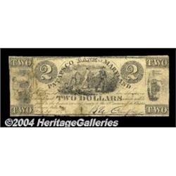 Ellicotts Mills, MD- Patapsco Bank of Maryland $2 Aug. 29, 1837 G10 Shank 43.2.10Another note listed as SENC in Haxby and R-7 in Shank. Very Good, with a couple of splits and a repair. <BR><BR><B>Important notice:</B> Heritage usually auctions material at the rate of 200-250 lots per hour. On some occasions eBay Live bid software or the Internet may not be able to keep up with the pace of the auction. We recommend placing a realistic absentee bid now as insurance to avoid disappointment. Occasionally the auctioneer may eliminate or reject an eBay Live bid, and the auctioneer may also reopen a lot after the close of the eBay live bidding (usually because we missed an audience bid), and may reject your bid even if it shows you as the winning bidder. By bidding via eBay Live, you agree that Heritage may award the lot to another bidder at its sole discretion under the circumstances described above or any other reasonable circumstances. Since eBay bids are not shown to us until we open the lot on the floor, we treat those bids just like floor bids. In most cases the floor responds before the eBay bid is presented to us, due to Internet lag time, so for consistency we have made it a policy that floor bids are always considered first over tie eBay live bids. Also please note that all Heritage lots purchased through eBay Live carry a 20% Buyer's Premium. Please make sure you read the Terms and Conditions before you bid. <BR><BR><B>IMPORTANT ANNOUNCEMENT ABOUT RESERVES:</B> Heritage now divulges all reserves on its web site 7 days before every auction. If you want to know whether the reserve on this lot has been met, and if not, what the reserve amount is, please visit this lot page on the HeritageCoin.com web site, or email: bid@HeritageGalleries.com