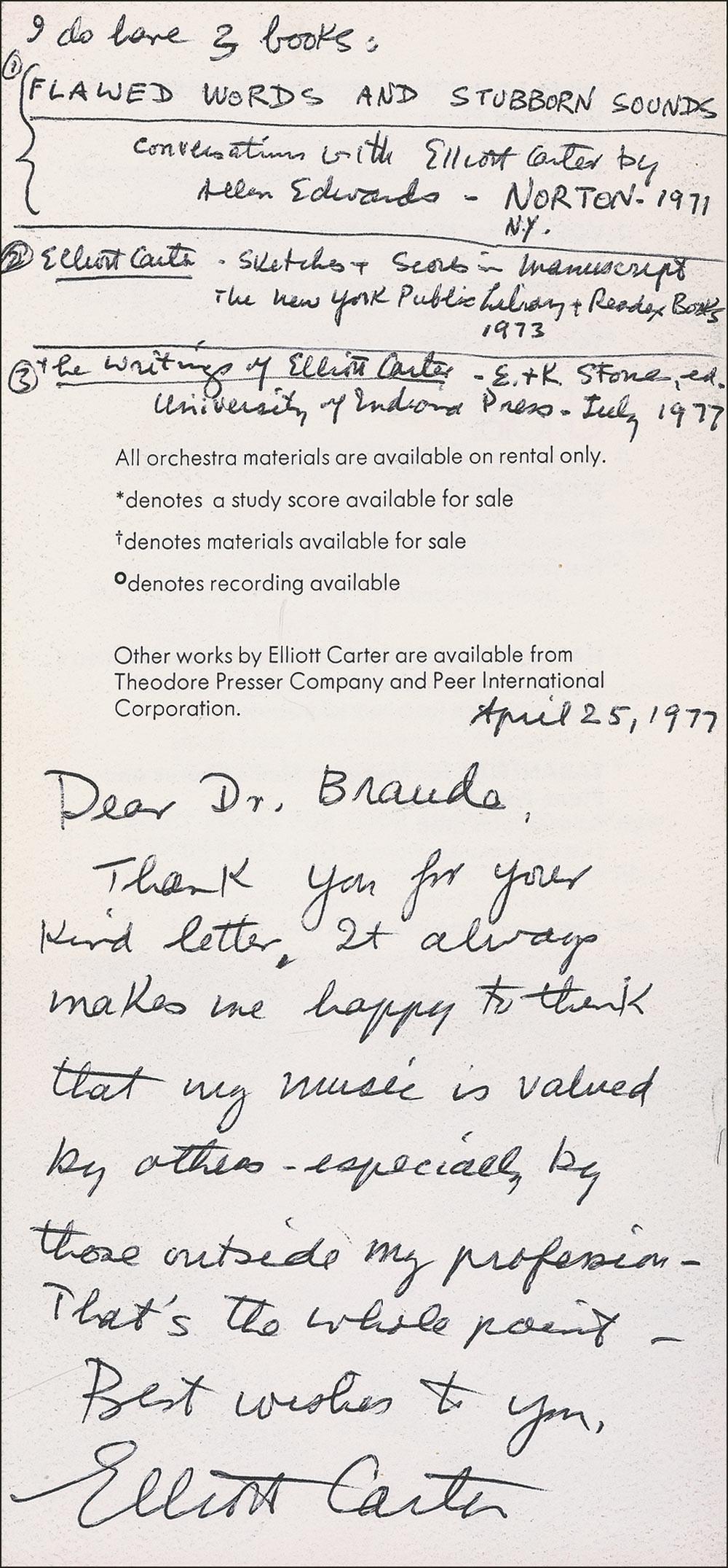 Two-time Pulitzer Prize-winning American composer (b. 1908). ALS, on the back cover of a 4 x 8.5 pamphlet about his work, April 25, 1977. Letter of gratitude to an admirer of his music. In part: “It always makes me happy to think that my music is valued by others—especially by those outside my profession. That’s the whole point.” Carter then lists three of his books at the top, incorporating his name an additional three times. In fine condition. Accompanied by the original mailing envelope, filled out in Carter’s hand and signed on the reverse in the return address area, “Carter.” RRAuction COA.