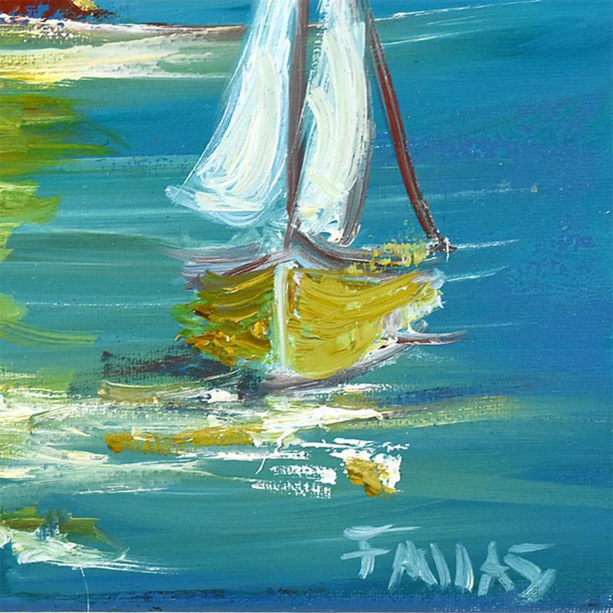"Sea Side Sail" is an original oil painting on stretched canvas by Elliot Fallas, hand signed by the artist. Includes Letter of Authenticity. Measures approx. 14" x 11" (image). The sides of the canvas are painted and it can be hung as is, but a frame is definitely recommended. Reference #: 252586