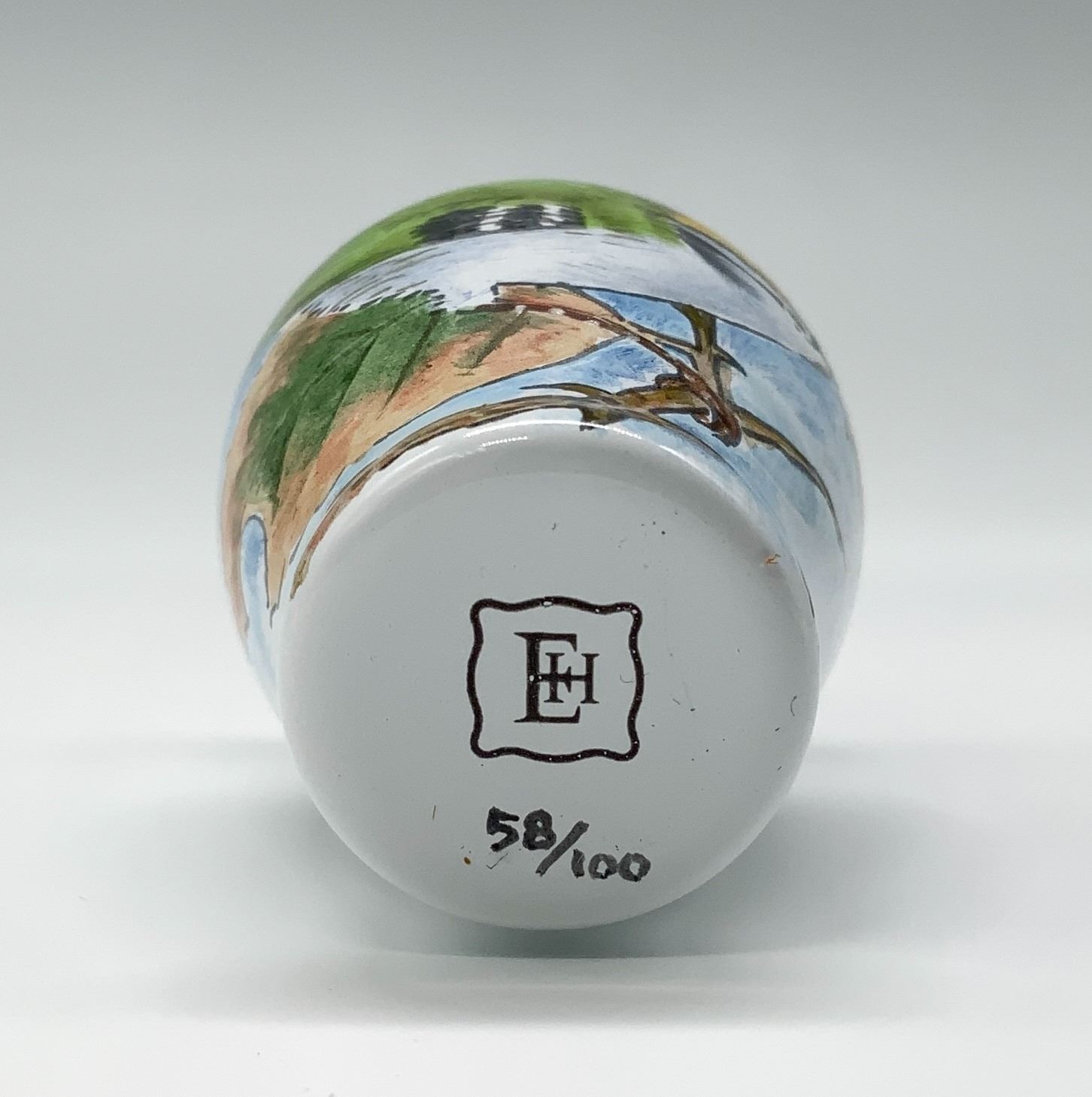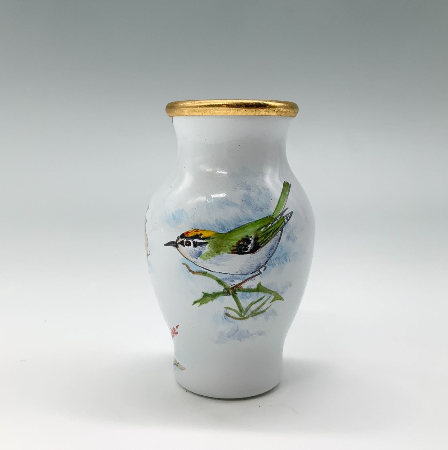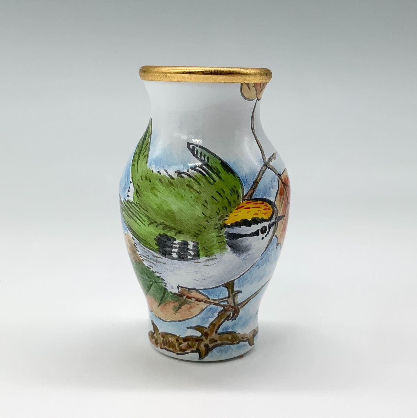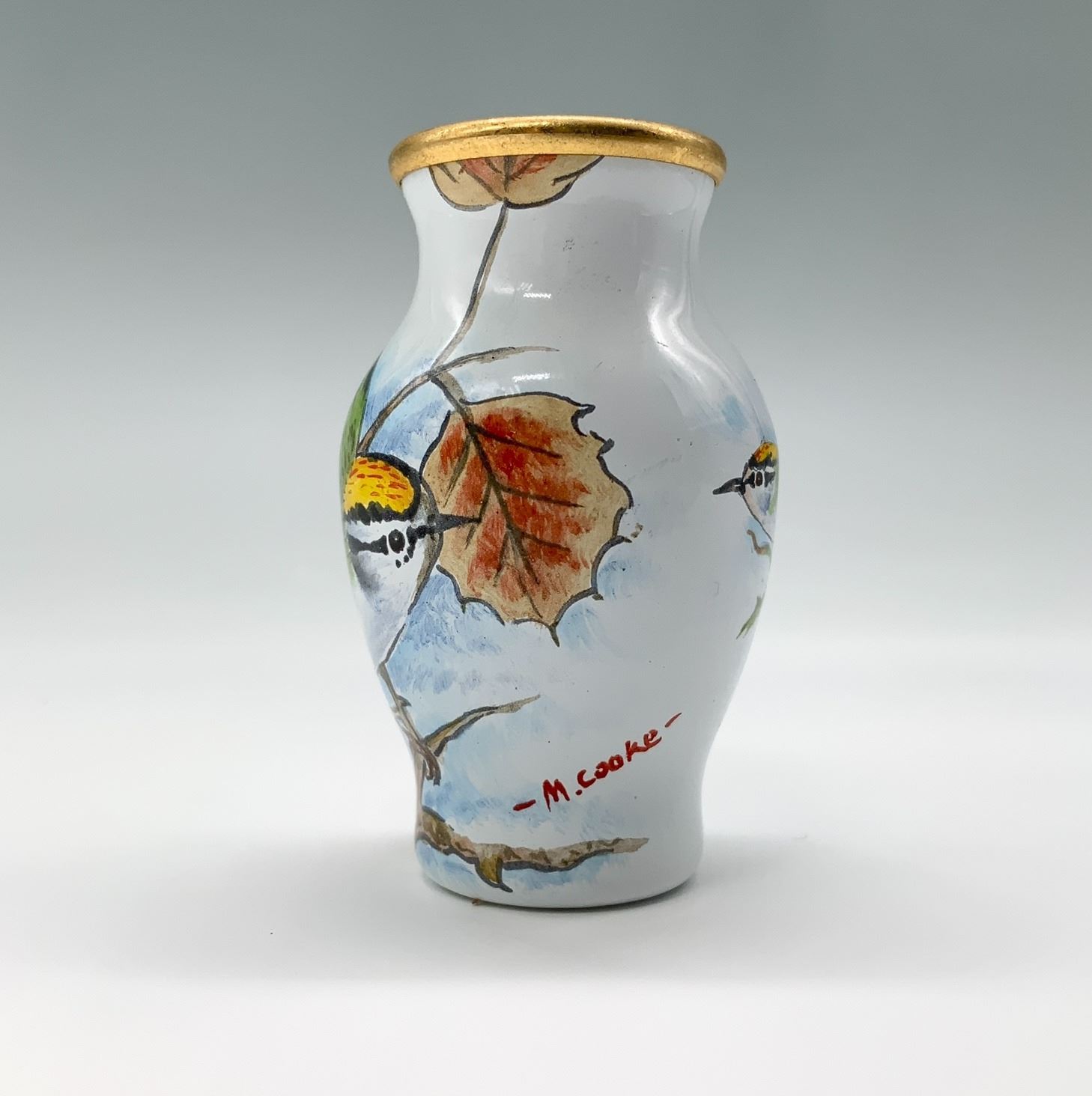 An exquisite hand-painted miniature enamel vase crafted by Elliot Hall. This charming piece features a detailed and vibrant depiction of warblers perched on delicate branches, set against a soft natural background. The gold trim adds an elegant finishing touch, highlighting the vase's timeless craftsmanship. Elliot Hall backstamp. Artist signed.