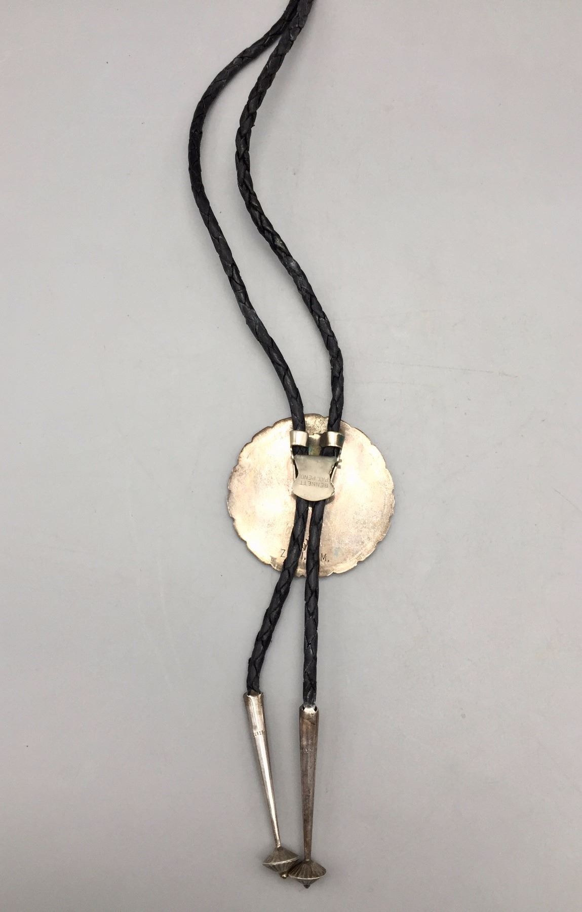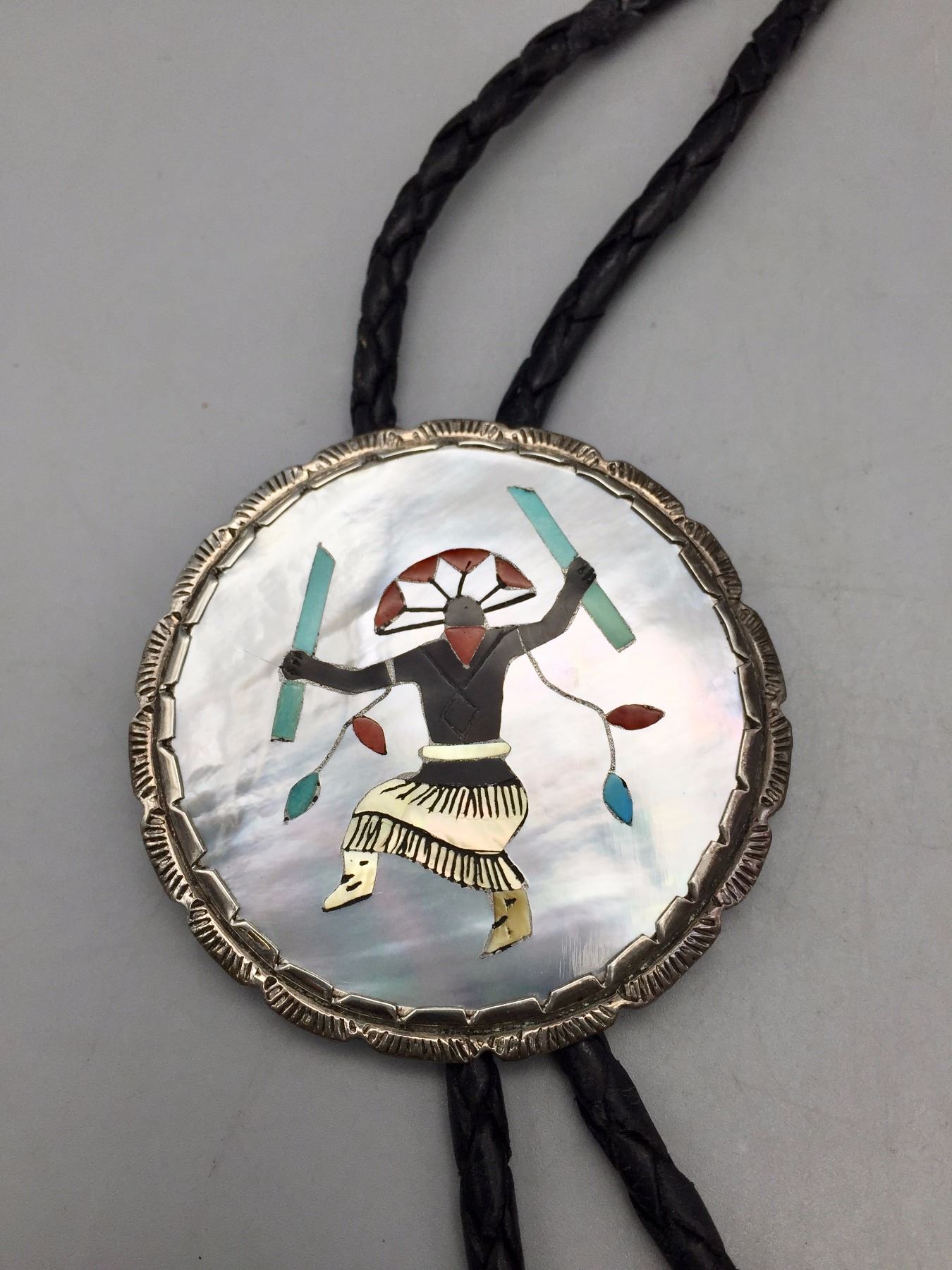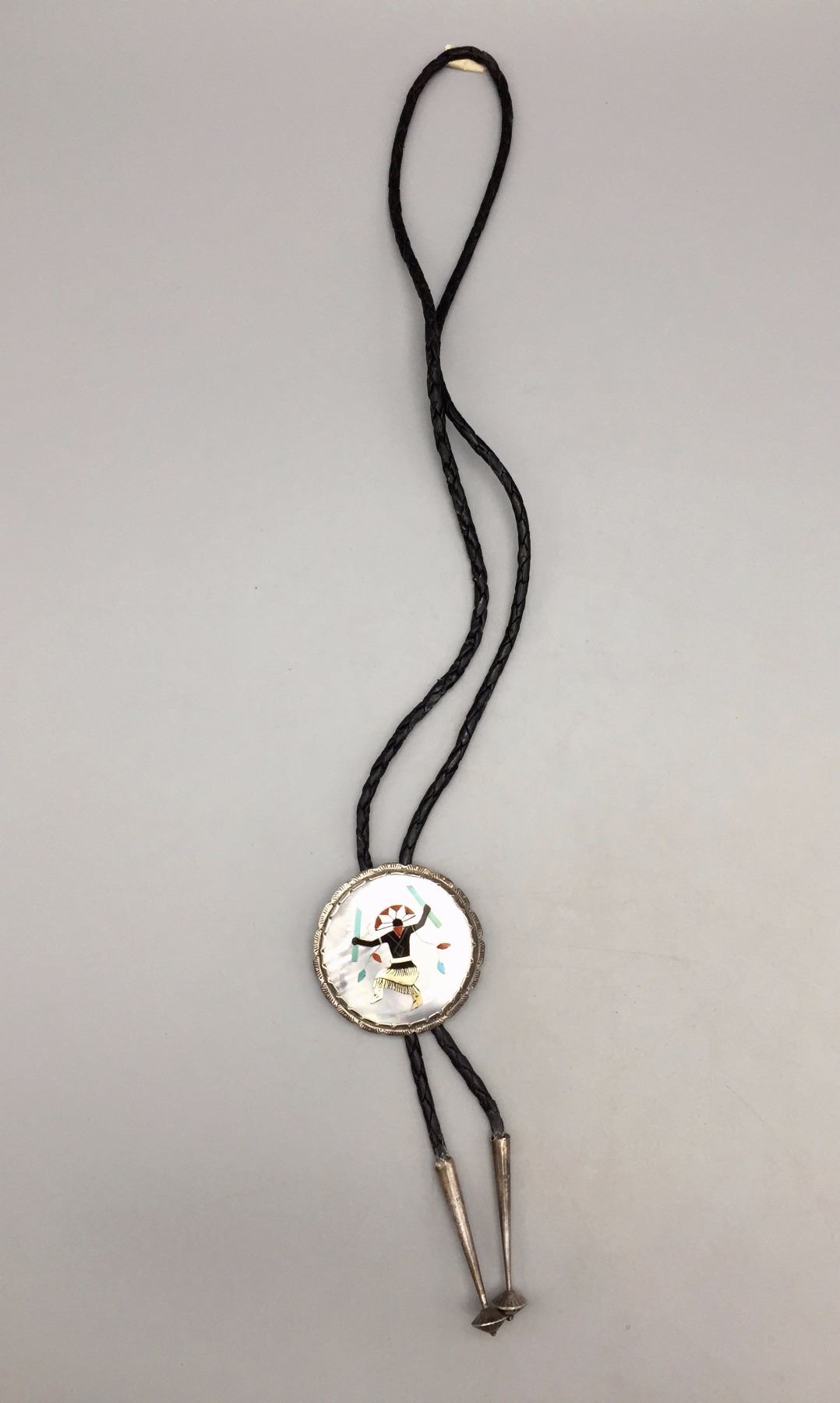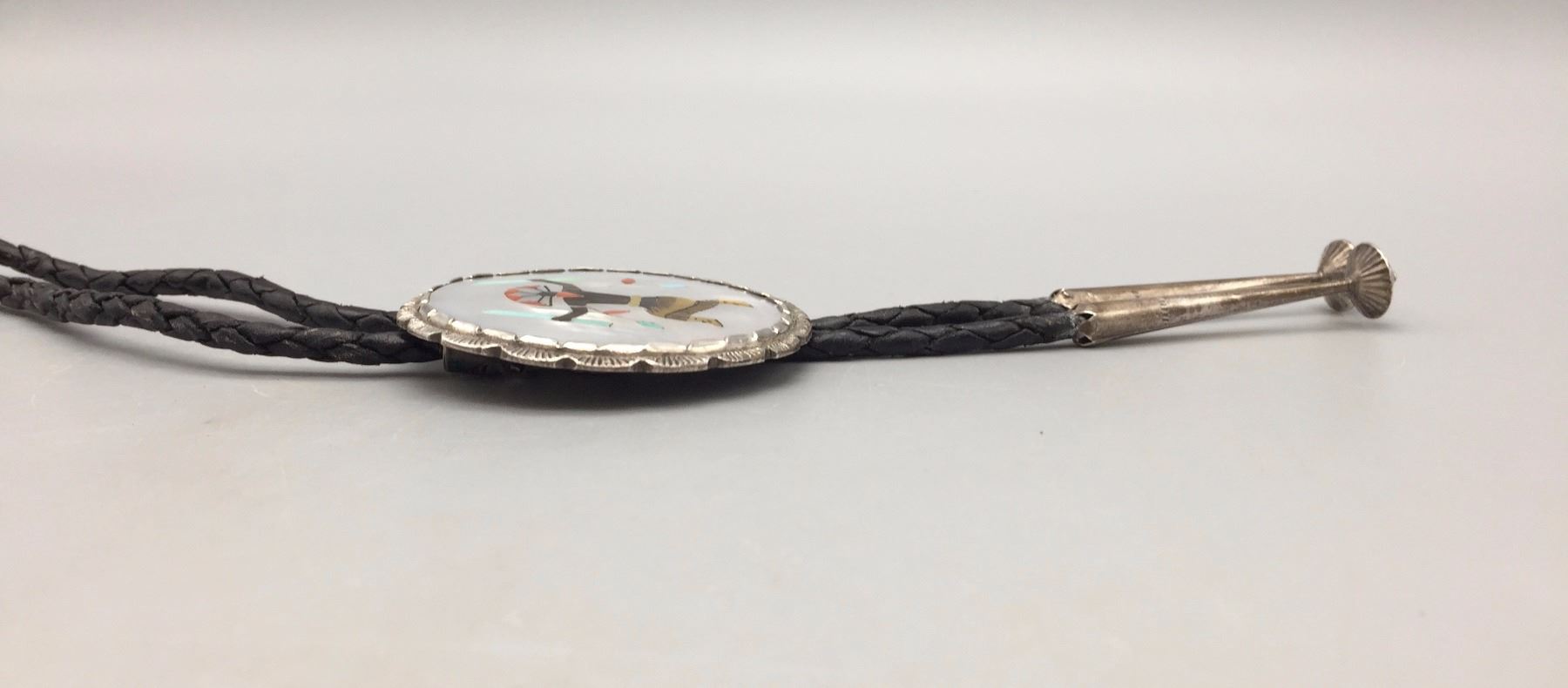 Description: A large sterling silver bolo slide inlaid with pieces of turquoise, mother of pearl, coral, etc. Black leather cord with sterling silver tips. (Matches the buckle in lot 116) Maker: Hallmarked with Elliot Qualo’s stamp and Zuni, N.M. Approx. Age: Vintage. Circa late 1960s or early 1970s. Size: 38” around the neck and slide is 2 1/4” in diameter. Weighs 44.4 g. Condition: Good for its age, normal wear expected. Please look closely at the pictures - they are an important part of our description. Shipping: There will be a $5 handling / packaging fee for shipping this lot. The actual cost of postage will be added on top of that.