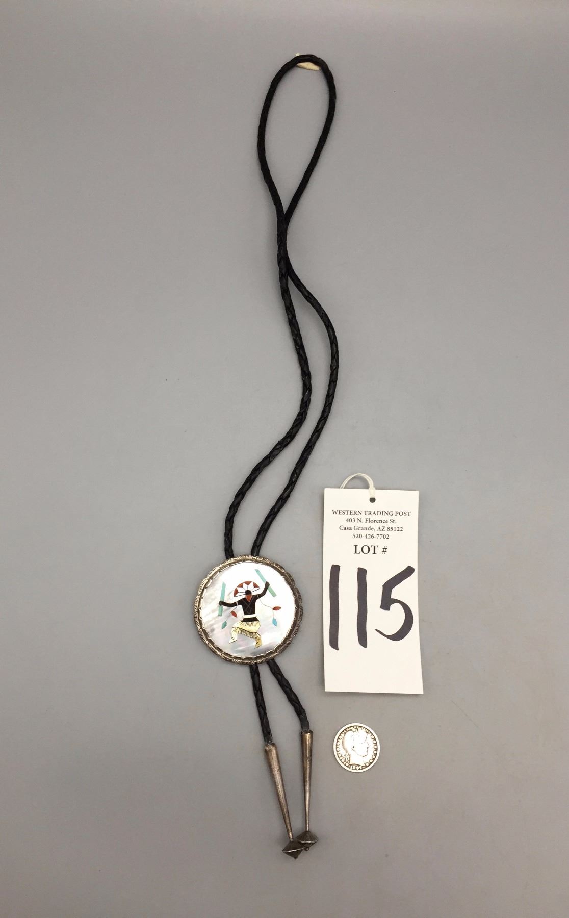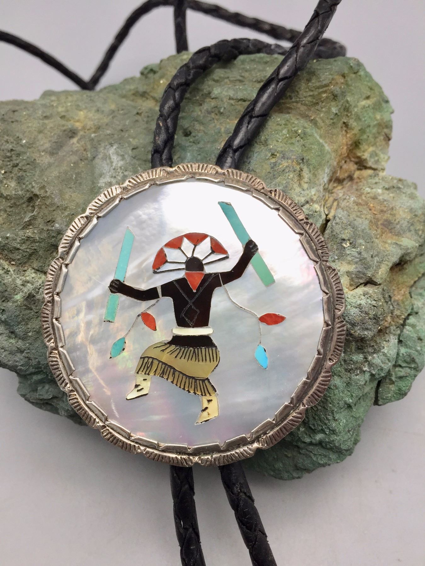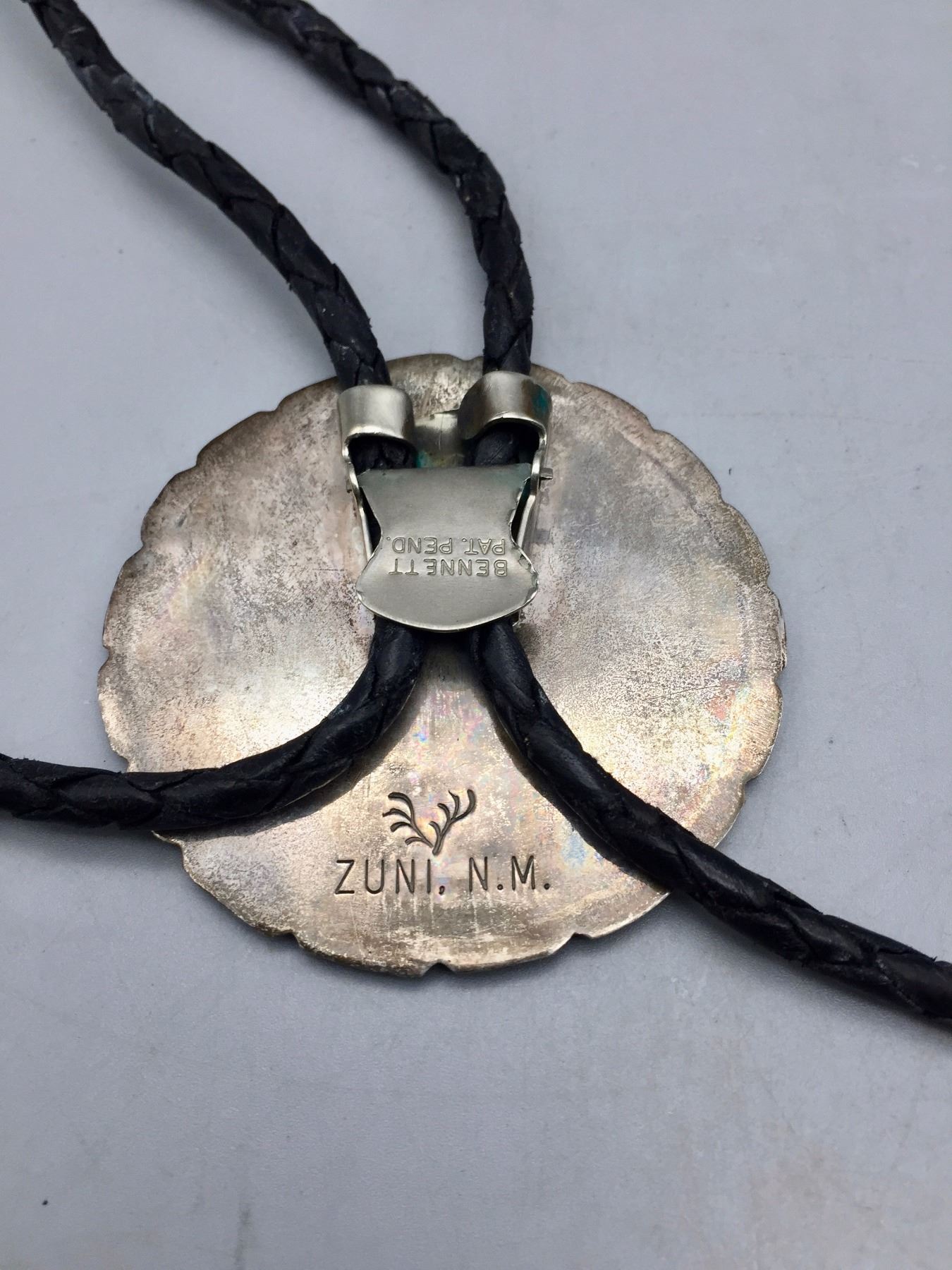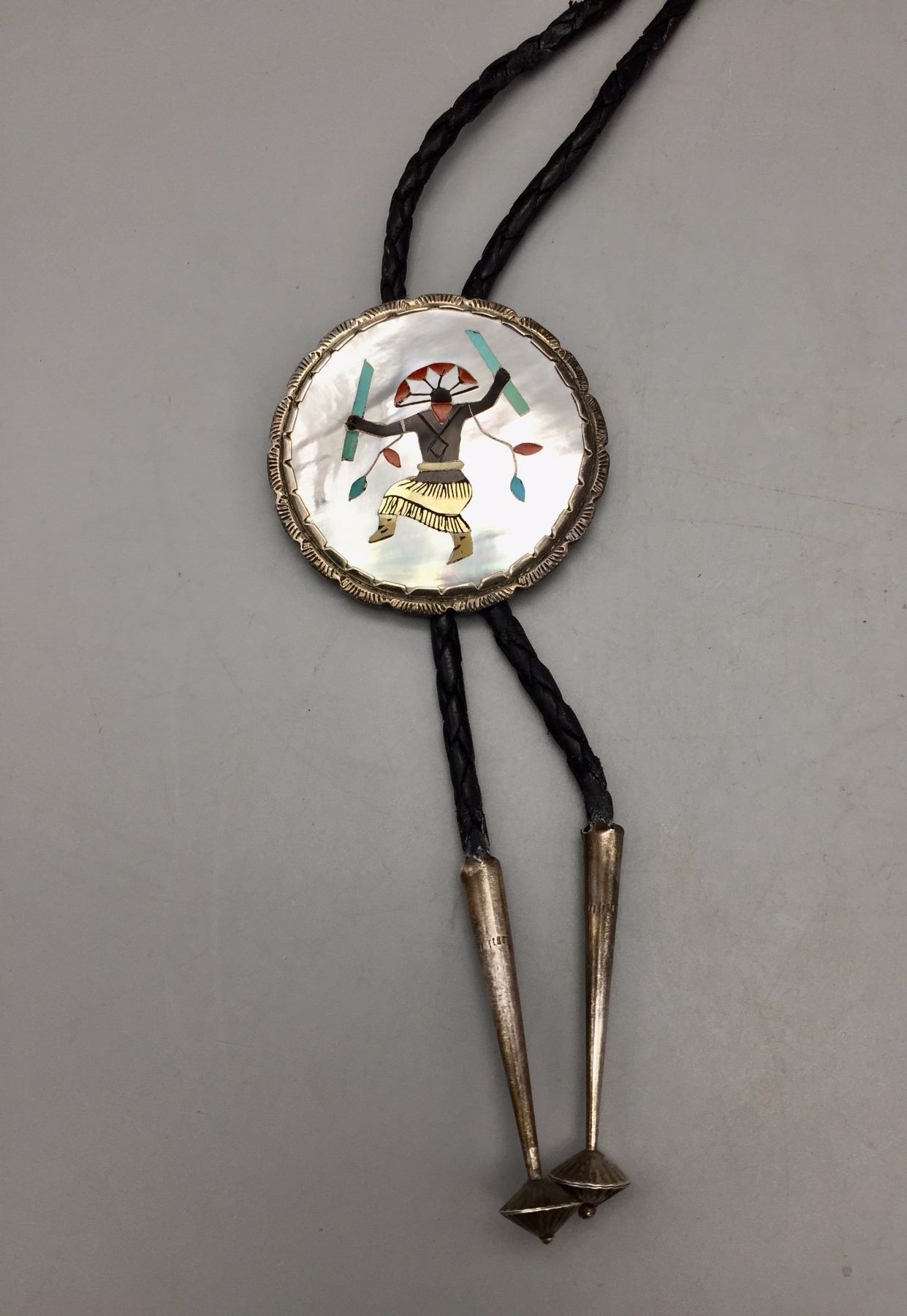 Description: A large sterling silver bolo slide inlaid with pieces of turquoise, mother of pearl, coral, etc. Black leather cord with sterling silver tips. (Matches the buckle in lot 116) Maker: Hallmarked with Elliot Qualo’s stamp and Zuni, N.M. Approx. Age: Vintage. Circa late 1960s or early 1970s. Size: 38” around the neck and slide is 2 1/4” in diameter. Weighs 44.4 g. Condition: Good for its age, normal wear expected. Please look closely at the pictures - they are an important part of our description. Shipping: There will be a $5 handling / packaging fee for shipping this lot. The actual cost of postage will be added on top of that.