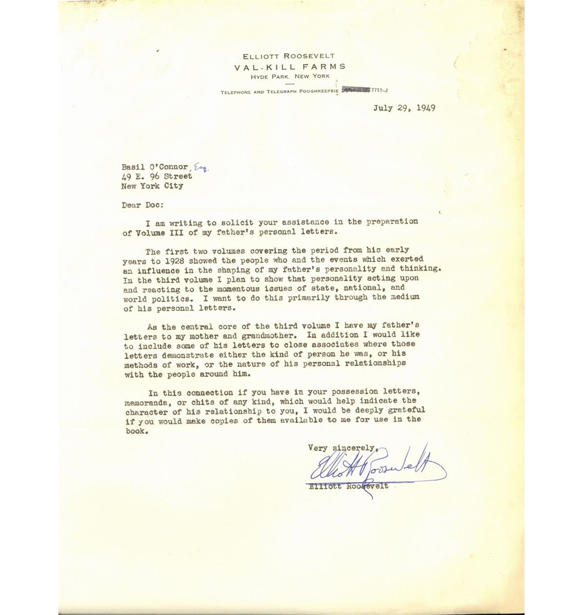 Typed Letter Signed by Elliot Roosevelt son of the president dated July, 29th, 1949. The letter is written to Basil O’Connor, former law partner of the president requesting for any letters in his possession, which would reflect on Roosevelt’s, character or relationship with O’Connor that would benefit the book that Elliot is working on.