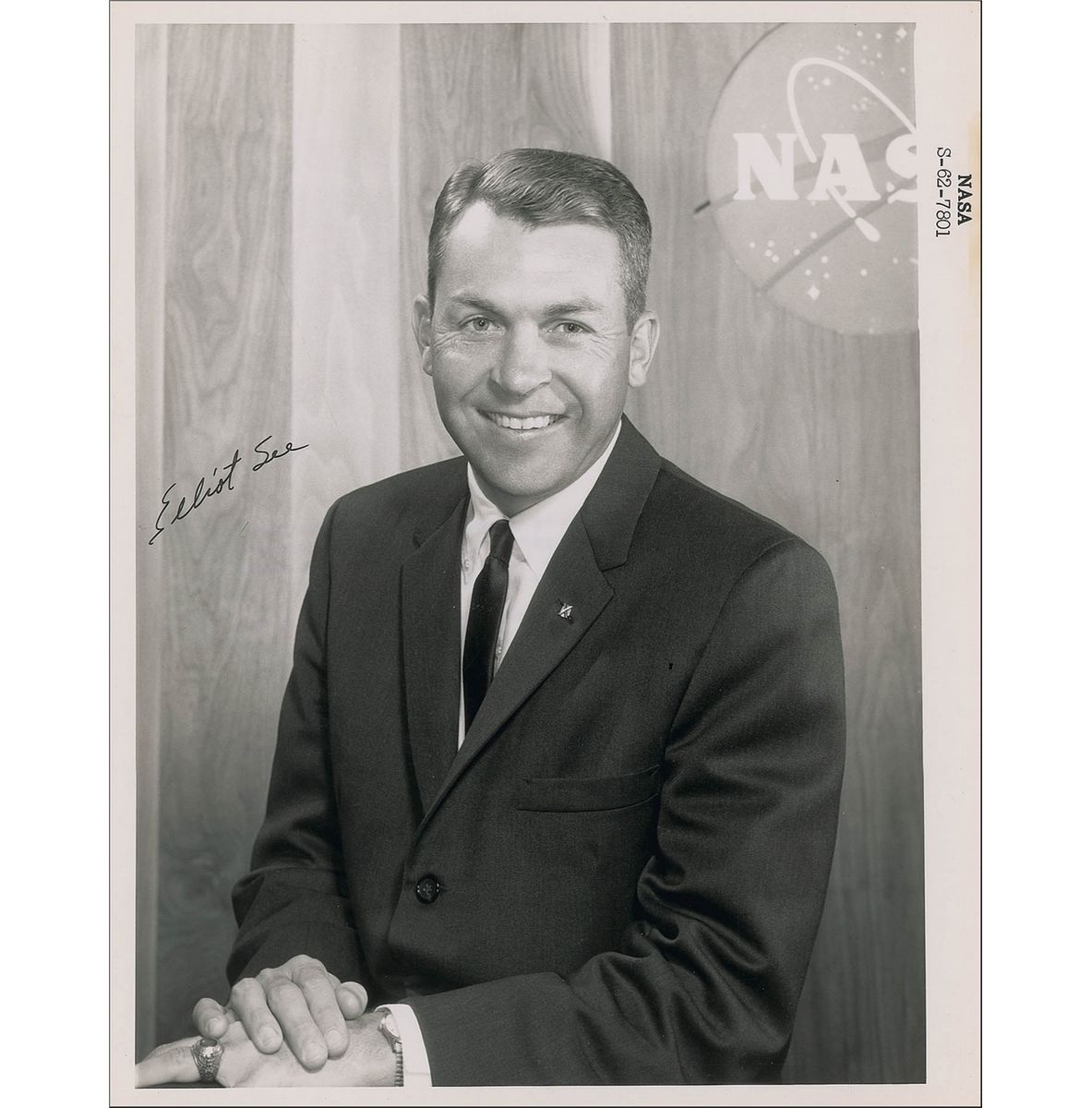 Vintage glossy 8 x 10 NASA photo of See in a jacket and tie, signed in black ink. A slight crease to the upper left corner and light block of toning to the right border, otherwise fine condition.