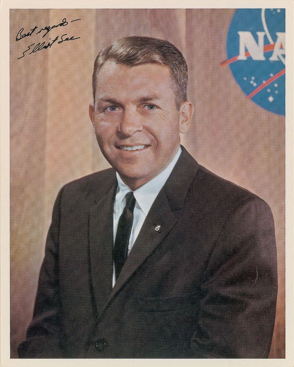 Official color 8 x 10 NASA lithograph of See posing in a suit and tie, signed in black felt tip, “Best regards—Elliot See.” In fine condition.