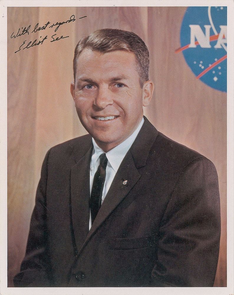 Official color 8 x 10 NASA lithograph of See in a formal half-length pose, signed in black felt tip, "With best regards—Elliot See." In very fine condition.