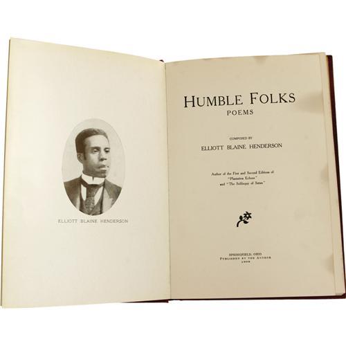 <B>Elliott Blaine Henderson <I>Humble Folks</B></I></B></I> (Springfield: published by the author, 1909), first edition, 65 pages, 8vo (5.5" x 8"), bound in maroon cloth with gold embossed title features, and inscribed by the author <I>"Complimentary to Chief Richard O'Brien. Best Regards, Elliott Blaine Henderson, Aug. 24th, 1909".</B></I> Henderson was noted for his Negro dialect poems - <I>"Ax me ef ah knows yo' daddy!".</B></I> The book is in good condition with some darkening to the cloth of the spine and some staining to the first few pages.