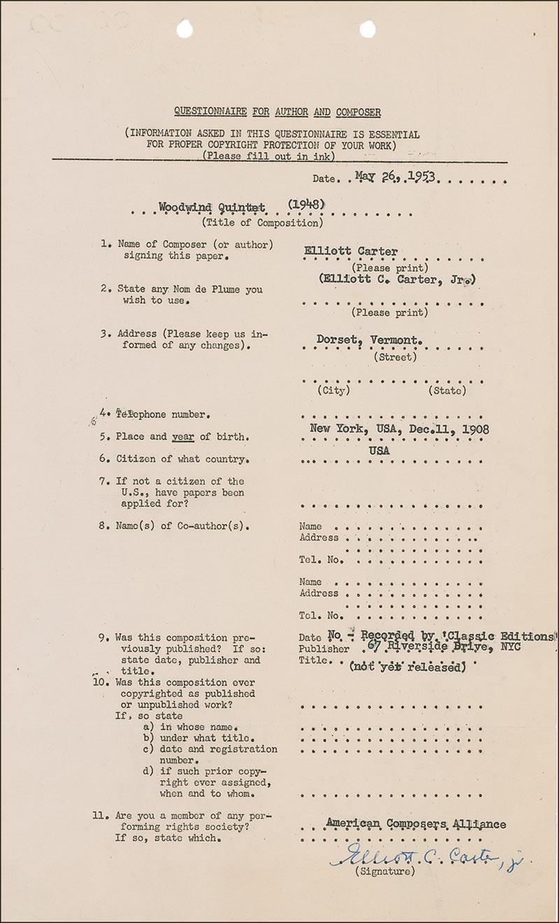 Two-time Pulitzer Prize winning American composer (b. 1908). Two one-page questionnaires, both signed “Elliott C. Carter, Jr.,” 8.5 x 14, both dated May 26, 1953, and both filled out in type and signed at the bottom by Carter. Both are for copyright information for two of his works, “String Quartet” (1951) and “Woodwind Quartet” (1948). Uniform light toning to both, and scattered light creases and wrinkles, otherwise fine condition.