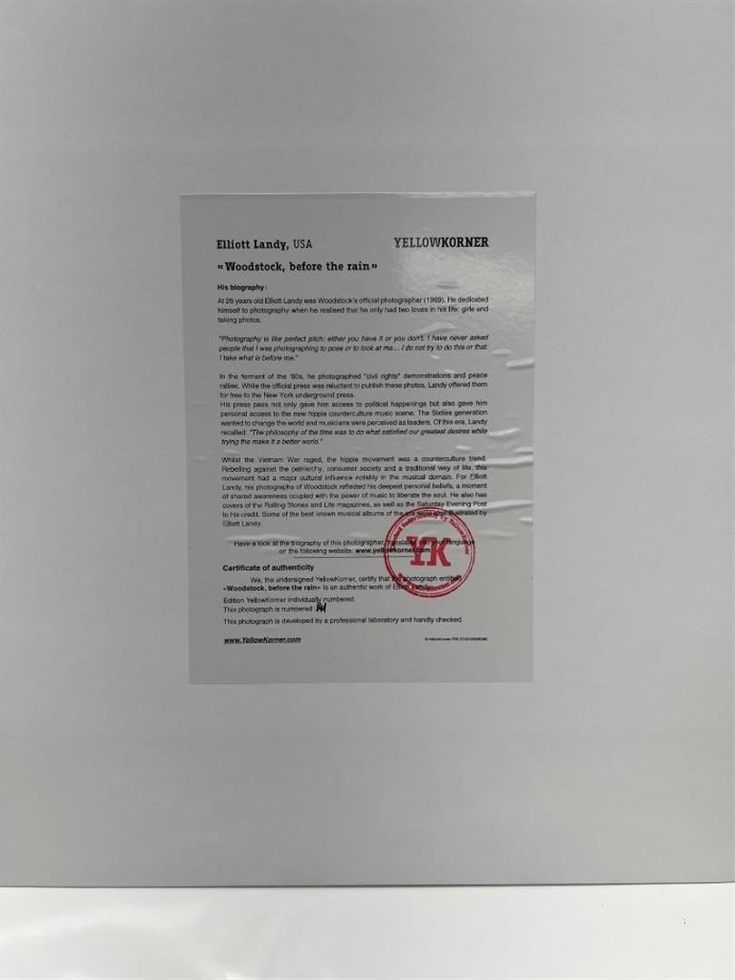 Elliott Landy Woodstock Before the Rain YellowKorner Certified Photograph. Certificate of Authenticity from YellowKorner affixed to the back. Matted Dimensions 16"x20". Protected with Clear Mylar Sleeve.